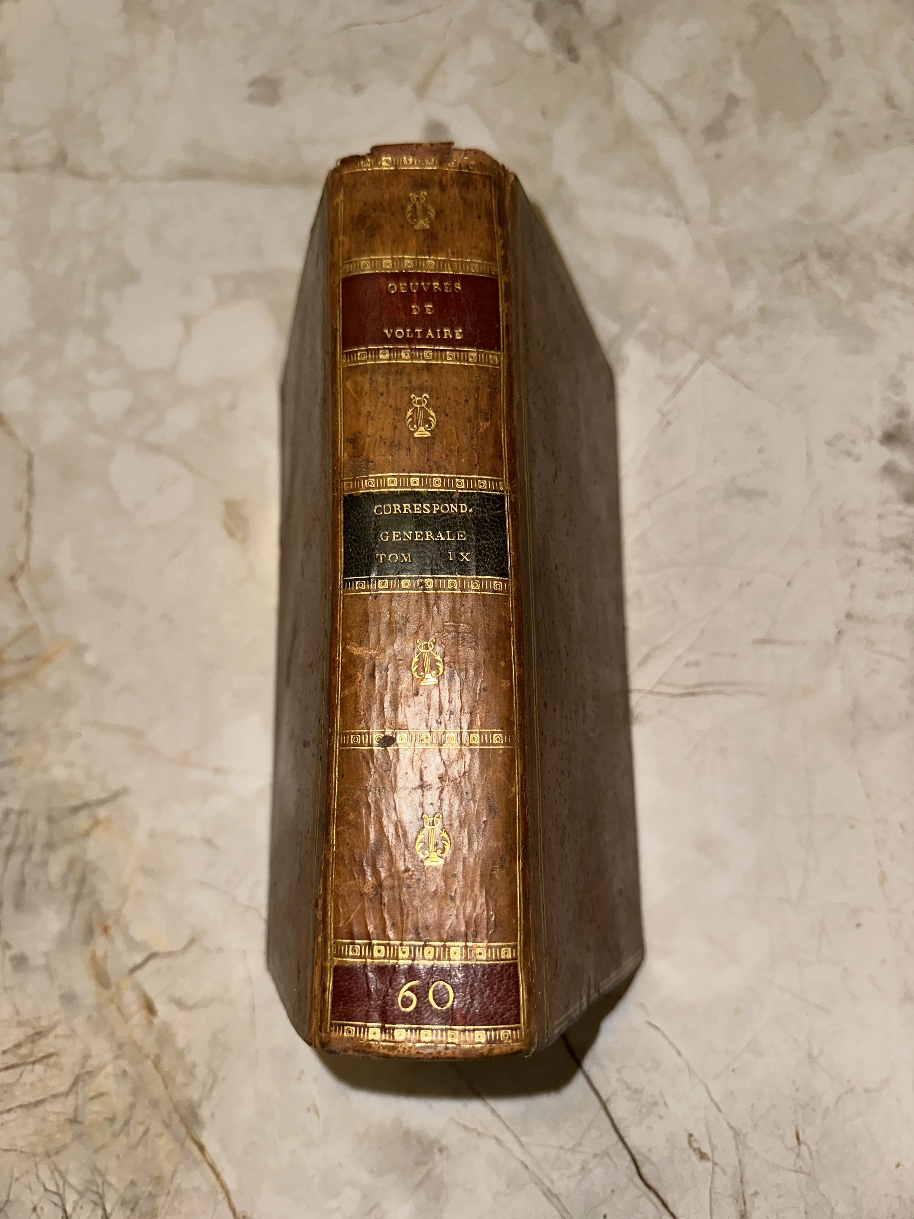 Изысканный образец книжного дела — девятый том переписки из собрания сочинений Вольтера в классическом кожаном переплете. Корешок украшен филигранным золотым тиснением с мотивами лир и геометрическим орнаментом, сохранившим свое благородное сияние. Благородная патина и характерная фактура старой кожи подчеркивают историческую ценность этого издания эпохи Просвещения.