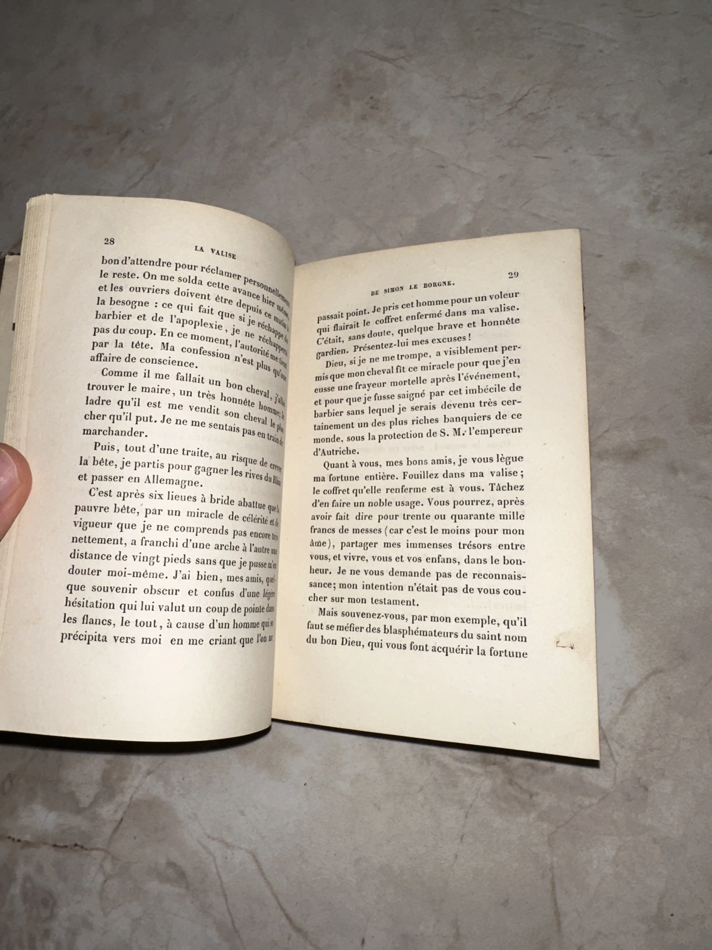 Этот редкий книжный разворот приглашает прикоснуться к истории через текст произведения «La Valise de Simon le Borgne». Пожелтевшая от времени бумага и изящная типографика XIX века сохранили прекрасную четкость, передавая аутентичный дух классической европейской литературы. Идеальный образец для ценителей старинной букинистики и французского шарма.