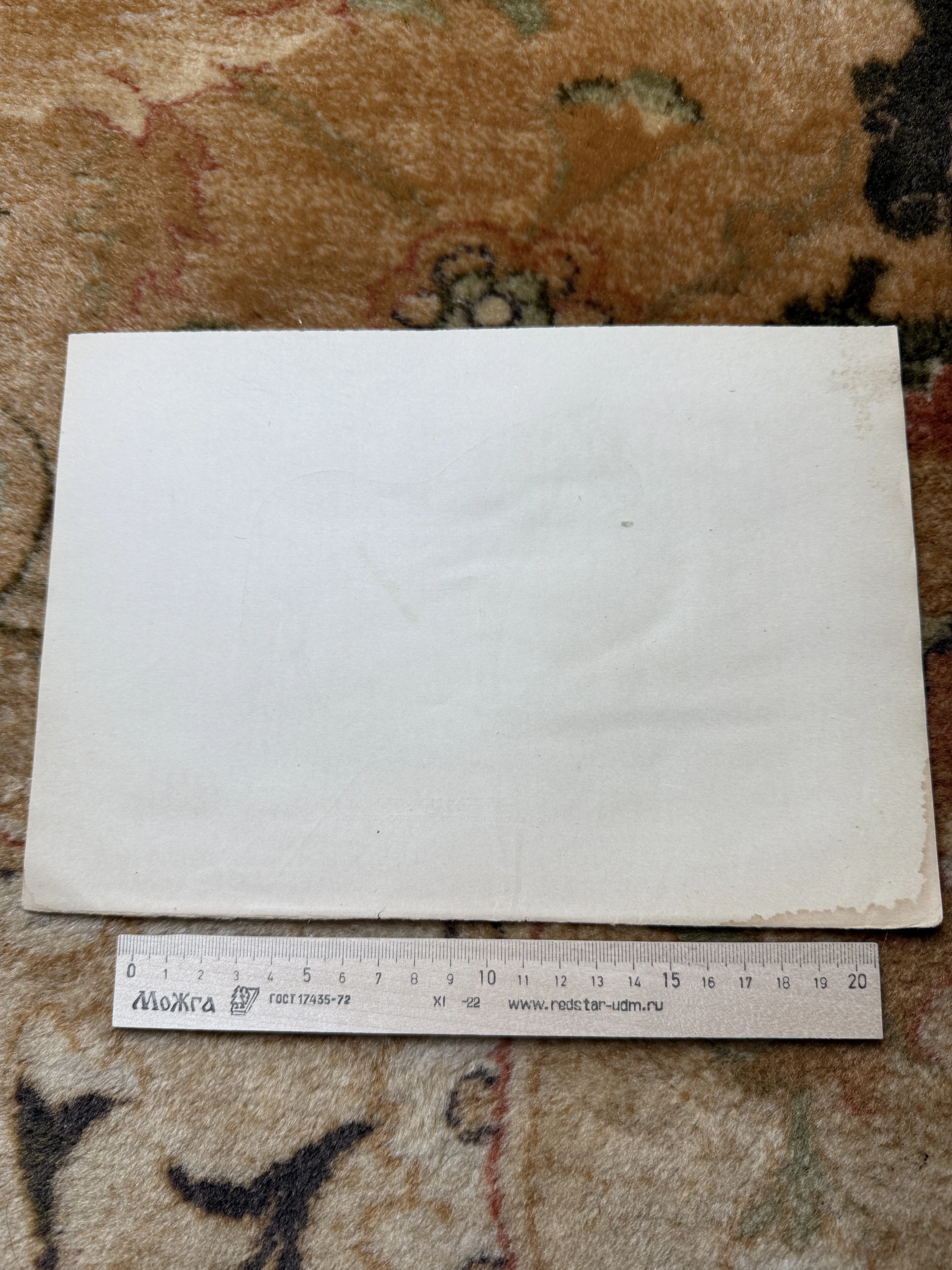 Чистая оборотная сторона артефакта сохранила благородную патину времени и характерное пожелтение по краям. Плотная фактурная бумага и отсутствие надписей делают этот экземпляр идеальным свидетельством ушедшей эпохи. Наглядная демонстрация размера с помощью линейки подтверждает подлинность и физическую сохранность предмета.