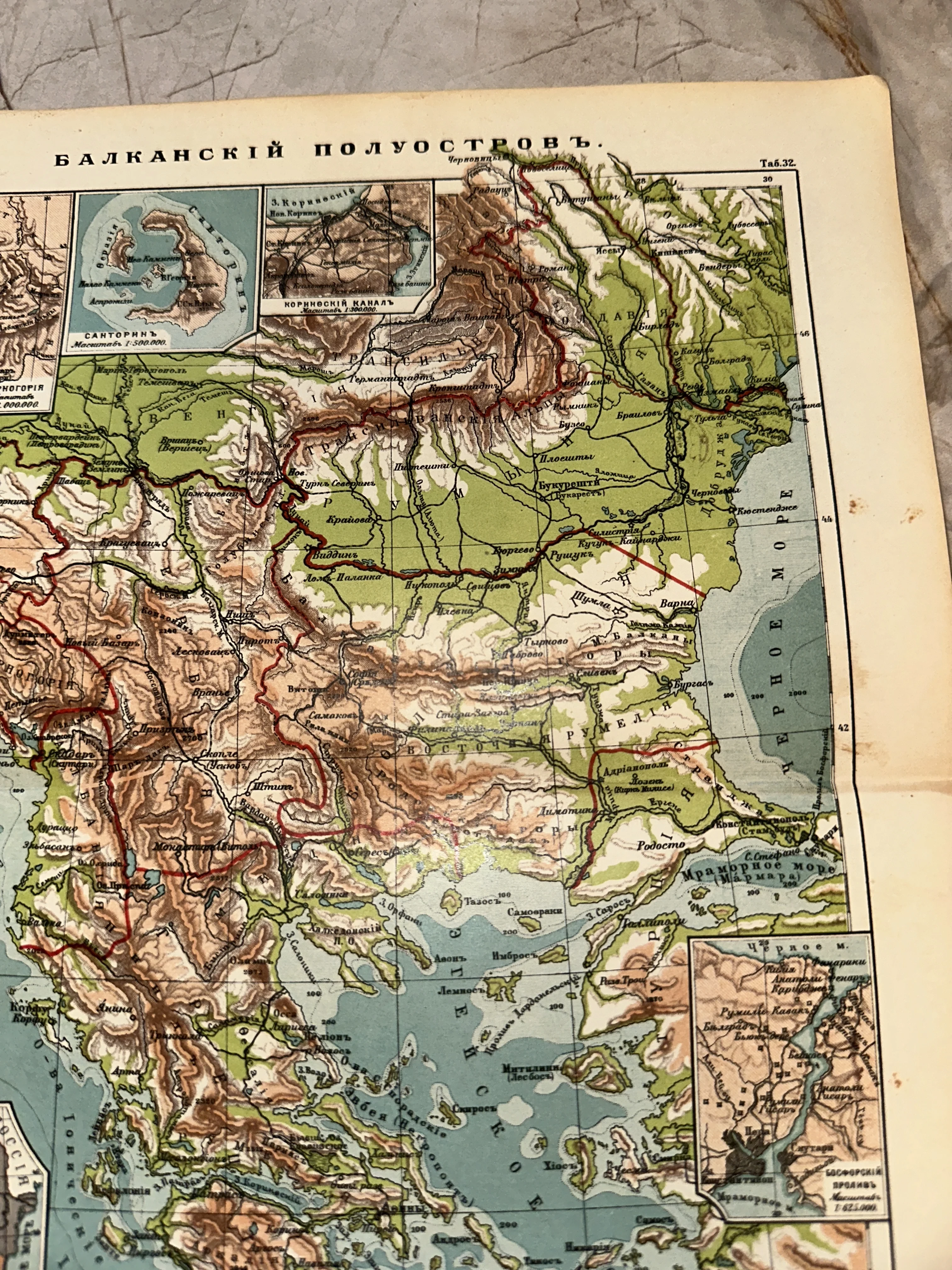 Цветная дореволюционная карта Балканского полуострова с детальным изображением рельефа, границ и морей.