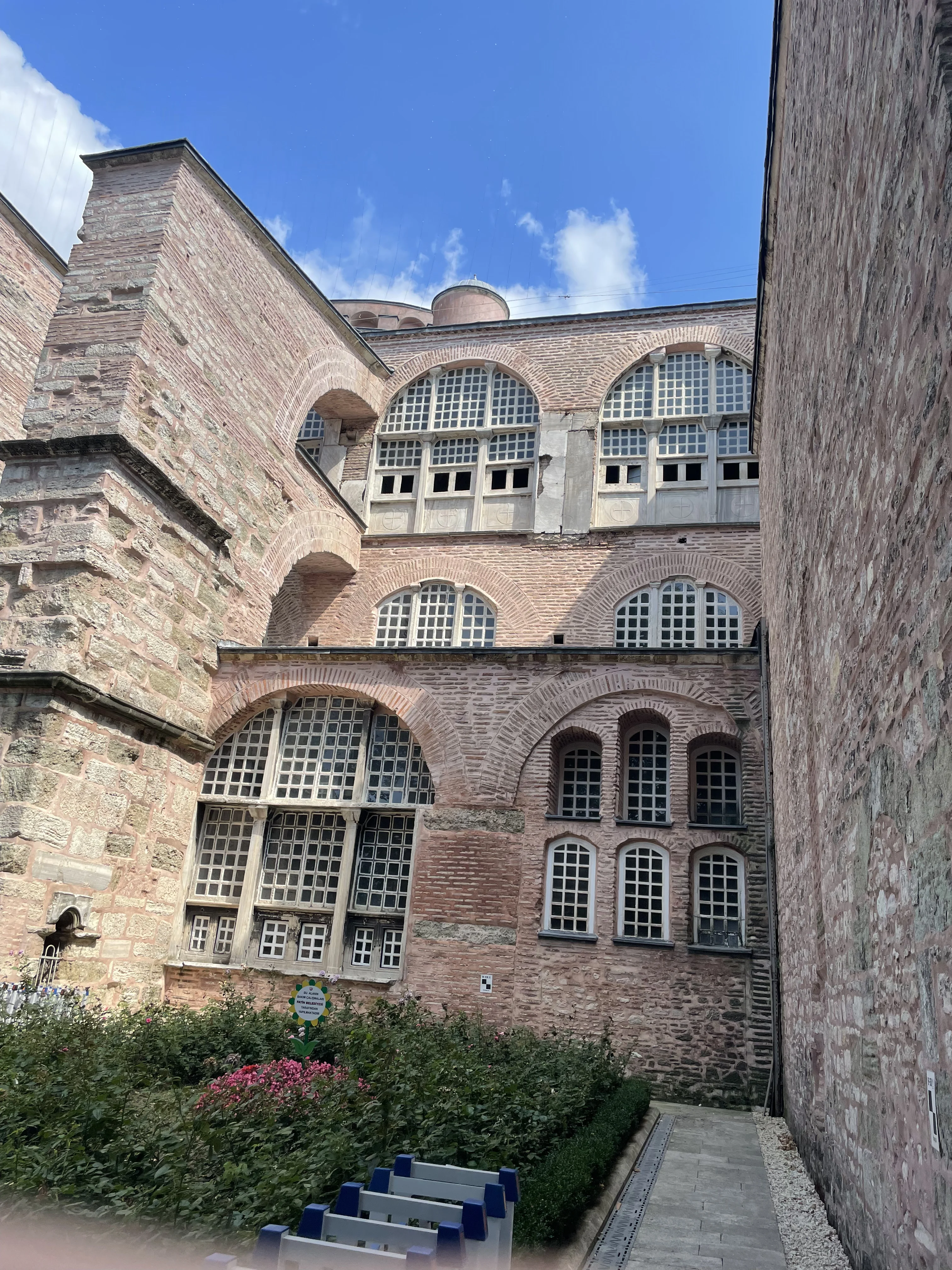 Перед вами фрагмент величественного фасада собора Святой Софии, где каждый камень дышит историей древнего Константинополя. Уникальное сочетание византийской слоистой кладки и изящных арочных окон создает неповторимый архитектурный ритм, запечатленный в лучах яркого солнца. Этот кадр позволяет в деталях рассмотреть монументальность строения и мастерство древних зодчих, сохранившееся сквозь века.
