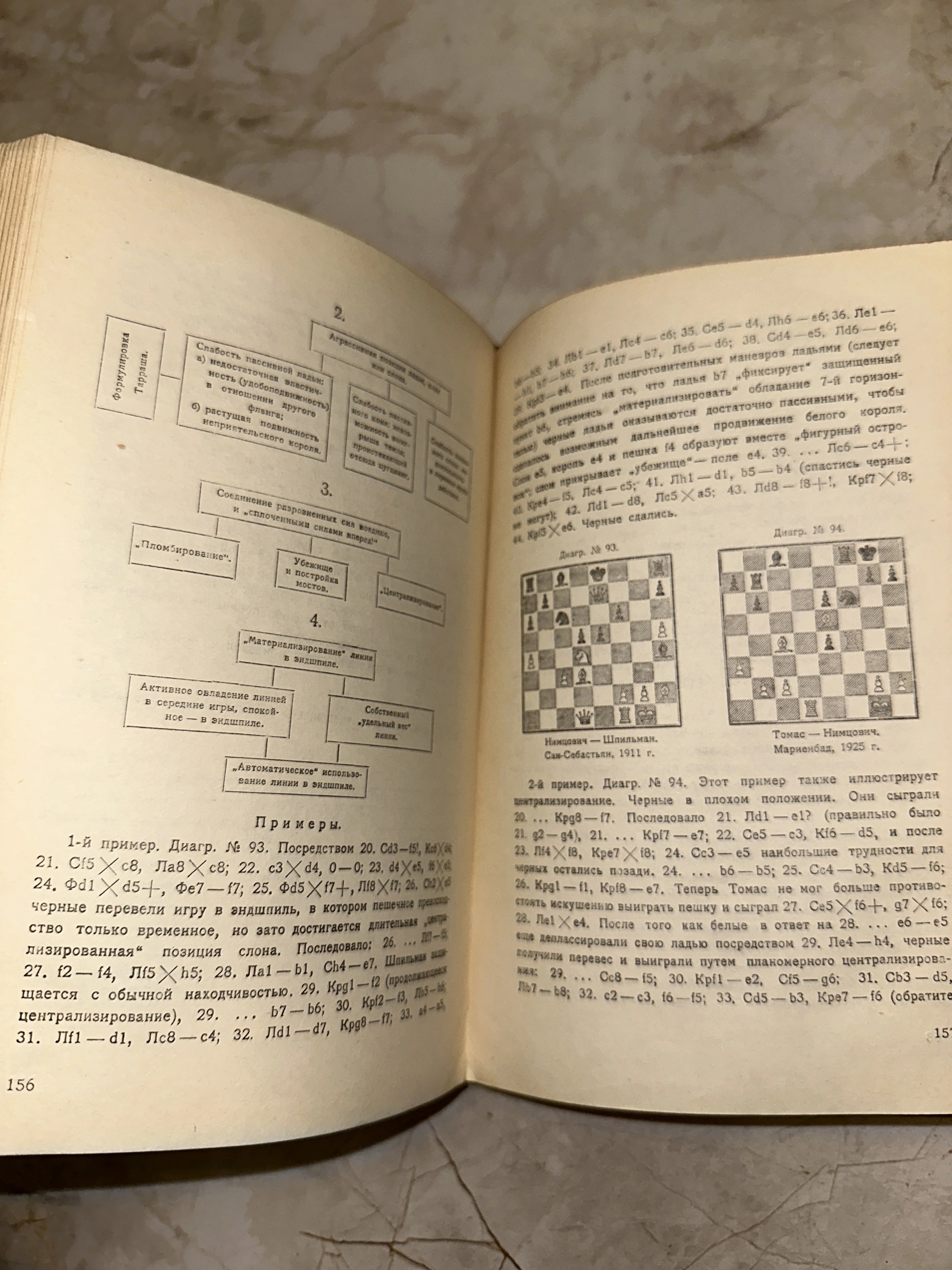Разворот старинной книги по шахматам с диаграммами партий Нимцовича и Томаса на пожелтевшей бумаге.