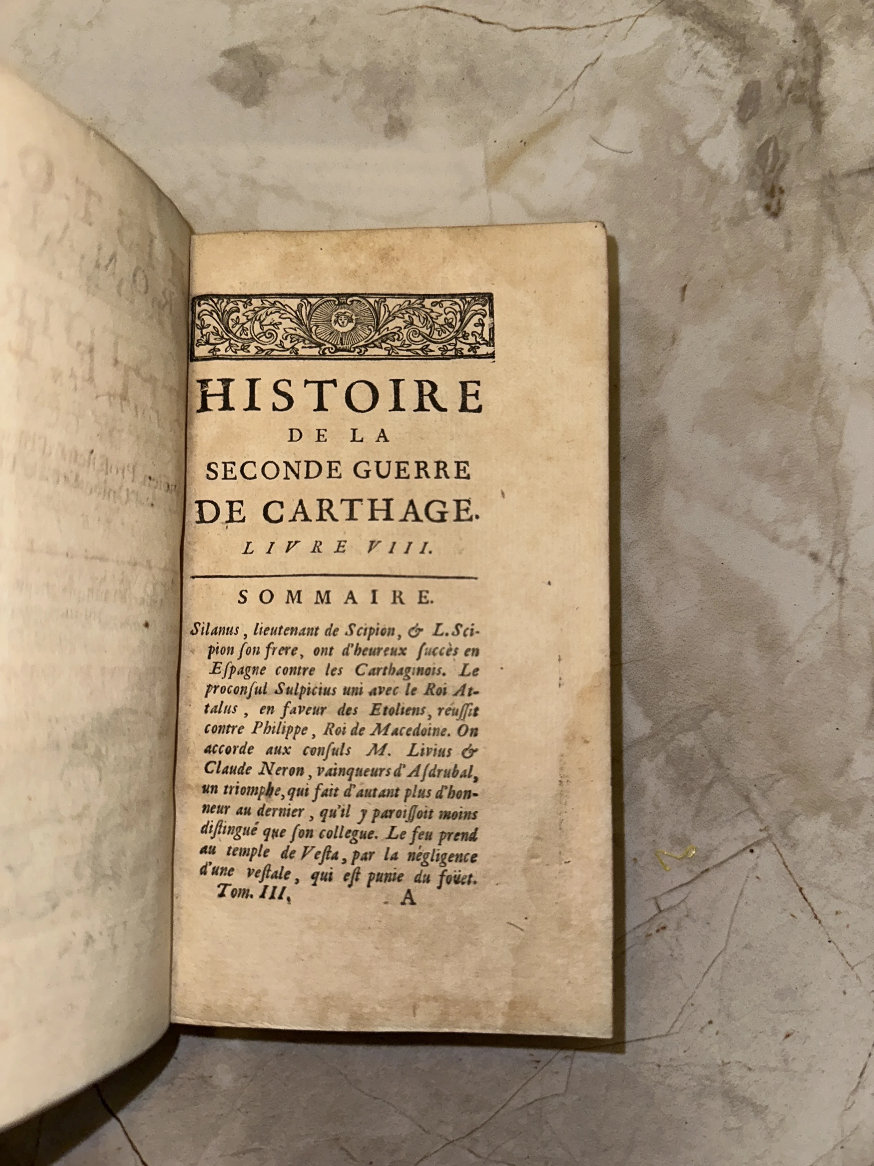 Перед вами подлинный фрагмент истории — страница из редкого антикварного труда на французском языке, посвященного эпическому противостоянию Рима и Карфагена. Благородная патина времени, изящная типографская виньетка и четкий классический шрифт передают атмосферу европейской книжной культуры прошлых веков. Этот экземпляр станет ценным дополнением библиотеки коллекционера редких фолиантов и любителей классической историографии.