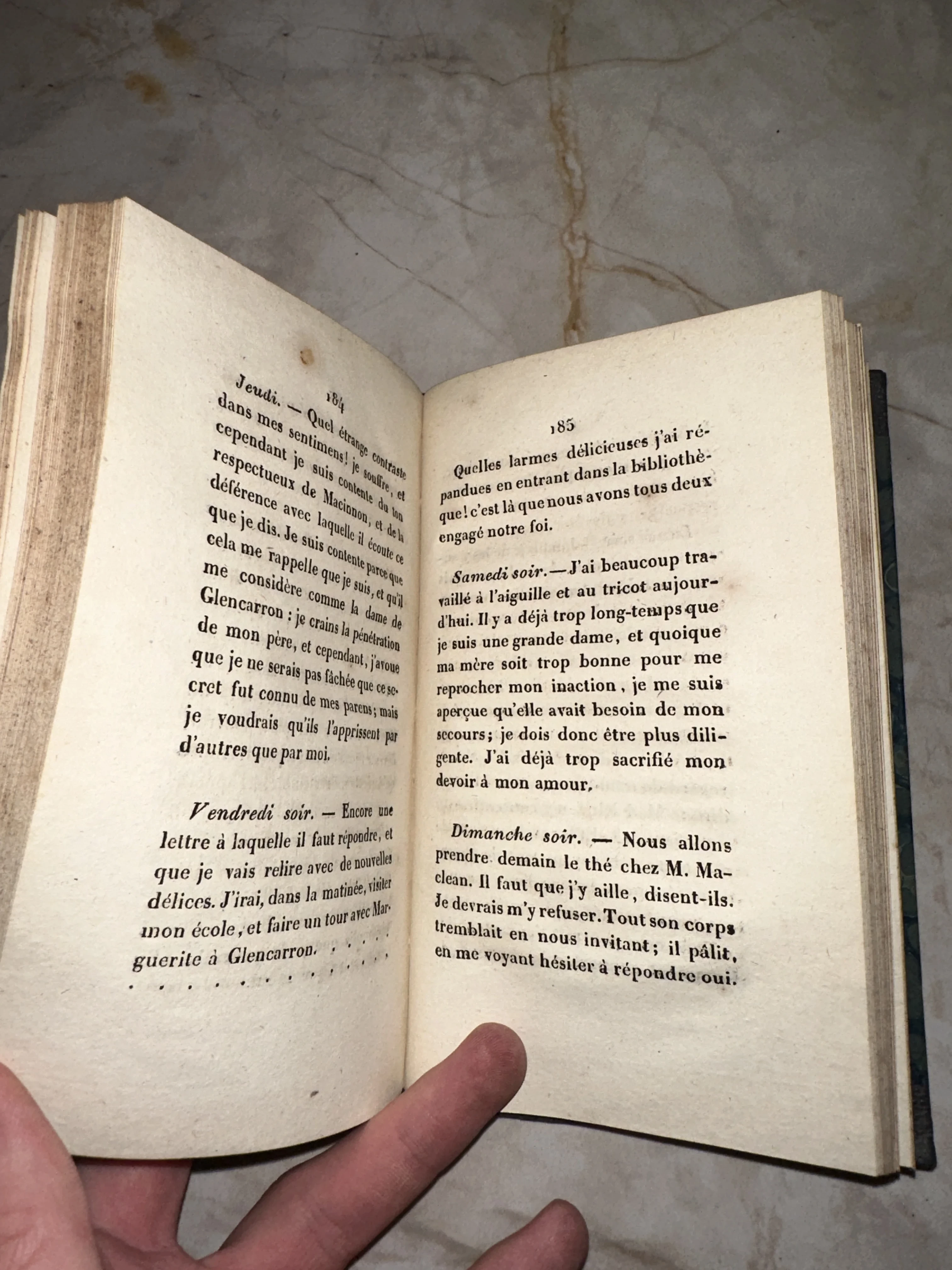 Изящный образец французской литературы, страницы которого оформлены как личные дневниковые записи. Благородная патина времени на бумаге и классическая типографика создают неповторимую атмосферу европейского кабинета XIX века. Редкий артефакт для истинных ценителей книжной эстетики и истории.