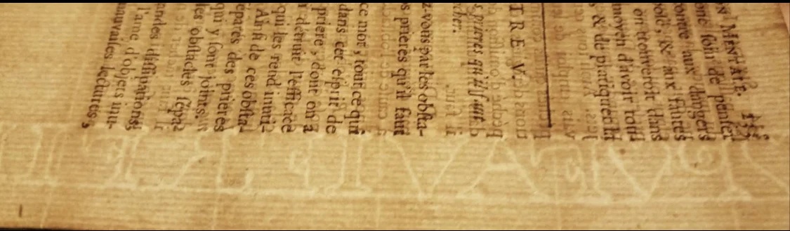 Крупный план старинной бумажной страницы с французским текстом и четким филигранным водяным знаком в нижней части.