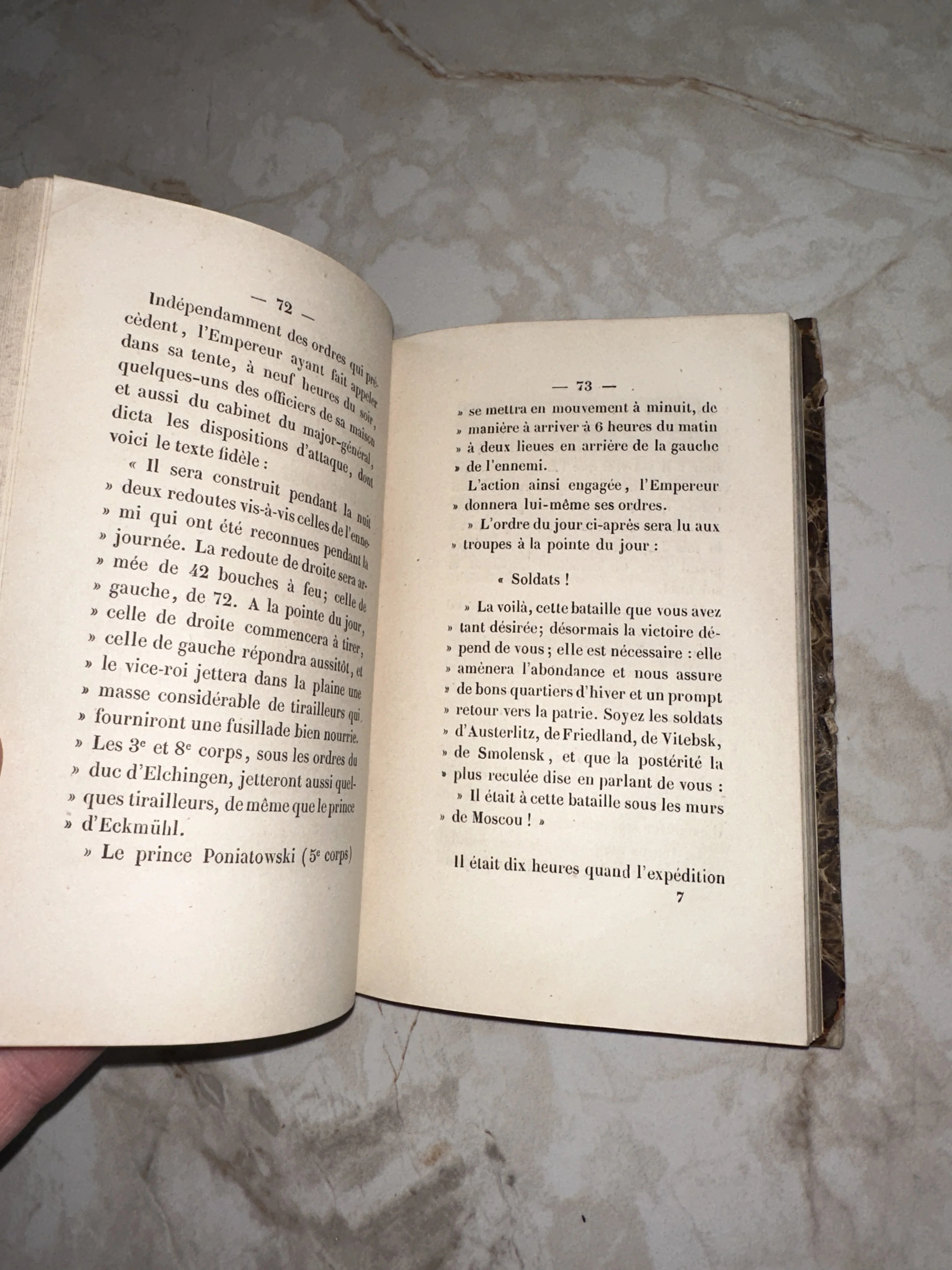 Разворот антикварной французской книги с текстом о приказах императора Наполеона и упоминанием городов Аустерлиц, Витебск, Смоленск и Москва.