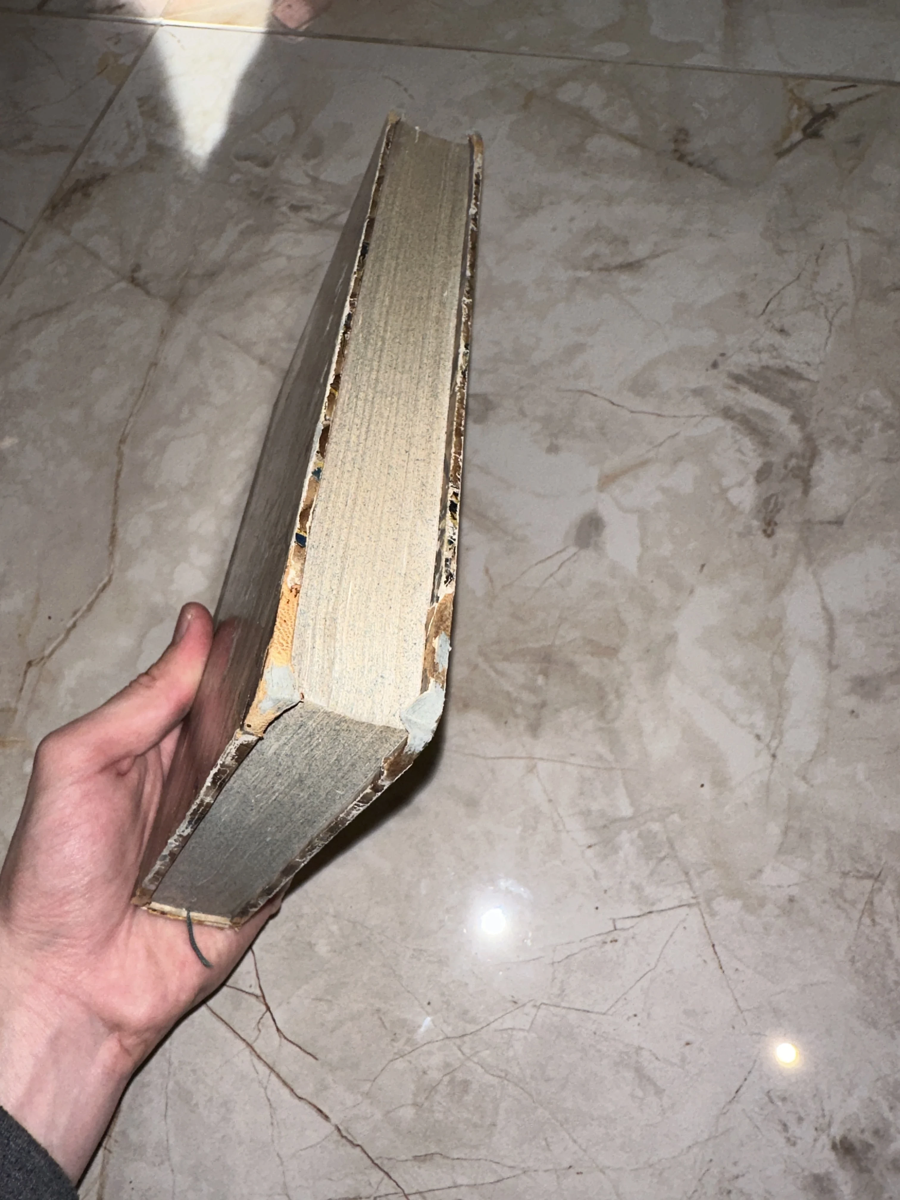 Этот массивный том хранит в себе дух ушедшей эпохи, о чем свидетельствуют благородная патина на обрезе и характерные следы времени на переплете. Пожелтевшие страницы и сохранившаяся шелковая закладка-ляссе подчеркивают подлинность и богатую историю этого коллекционного экземпляра. Ощутимая тяжесть книги и фактура старой бумаги создают неповторимое ощущение прикосновения к вечности.