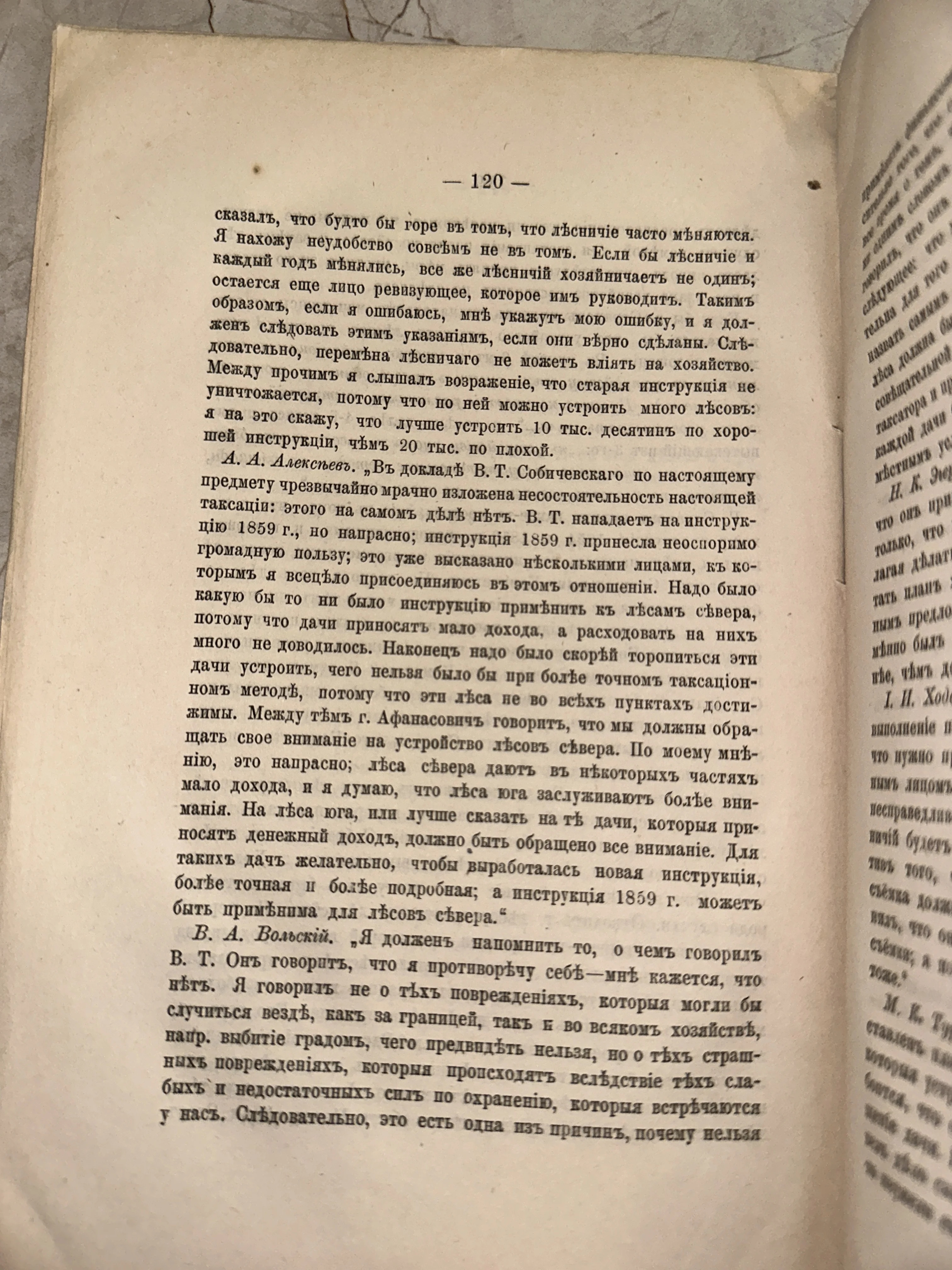 Перед вами подлинный фрагмент профессионального издания XIX века, запечатлевший дискуссии экспертов о лесоустройстве и таксации. Пожелтевшая от времени бумага и характерный дореформенный шрифт подчеркивают историческую ценность и аутентичность этого редкого научного труда. Идеальный предмет для коллекции по истории лесоводства или для оформления интерьера в стиле старинного кабинета.
