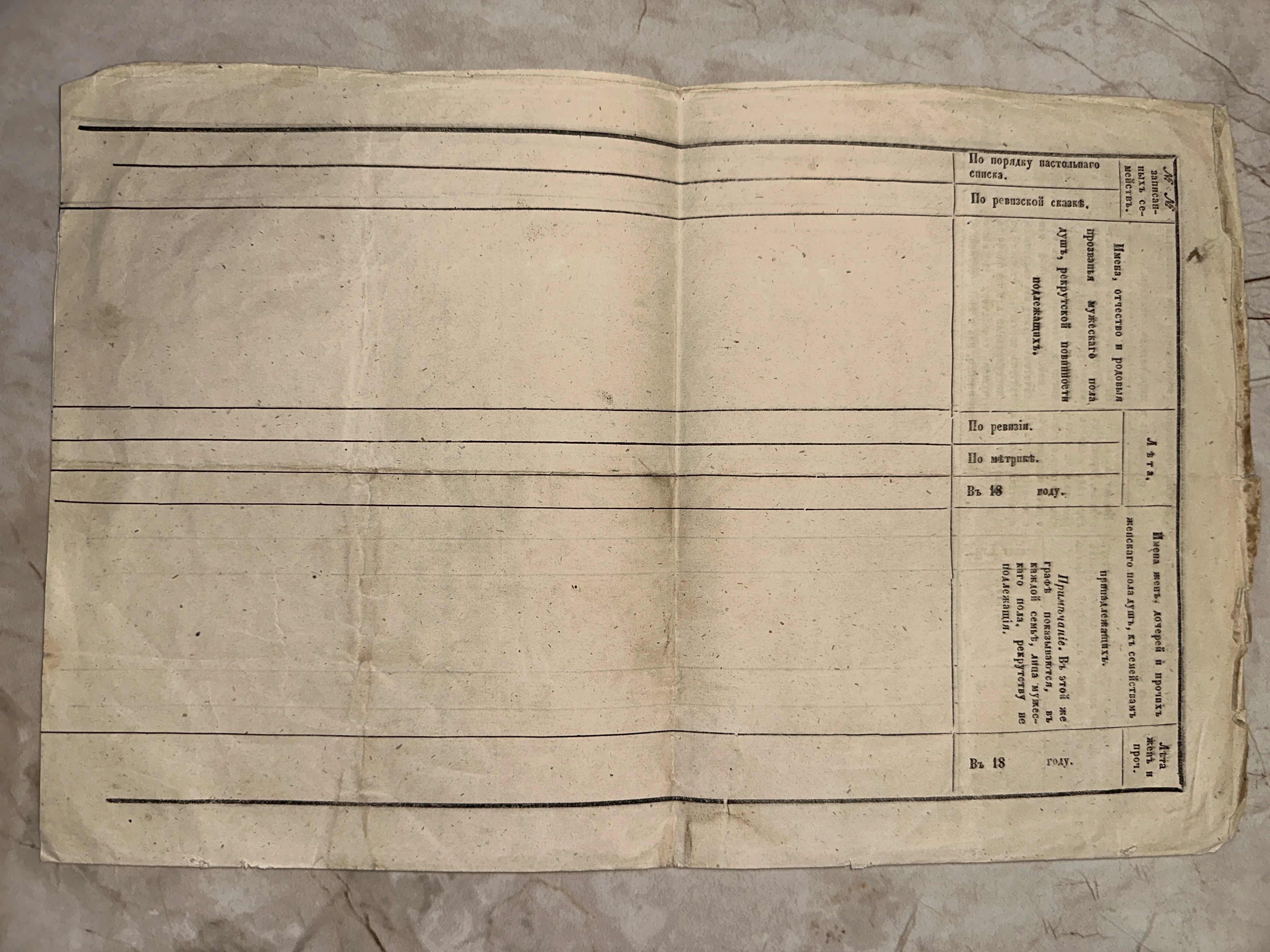 Антикварный типографский бланк для переписи населения Российской империи с графами для имен, возраста и ссылок на ревизские сказки.