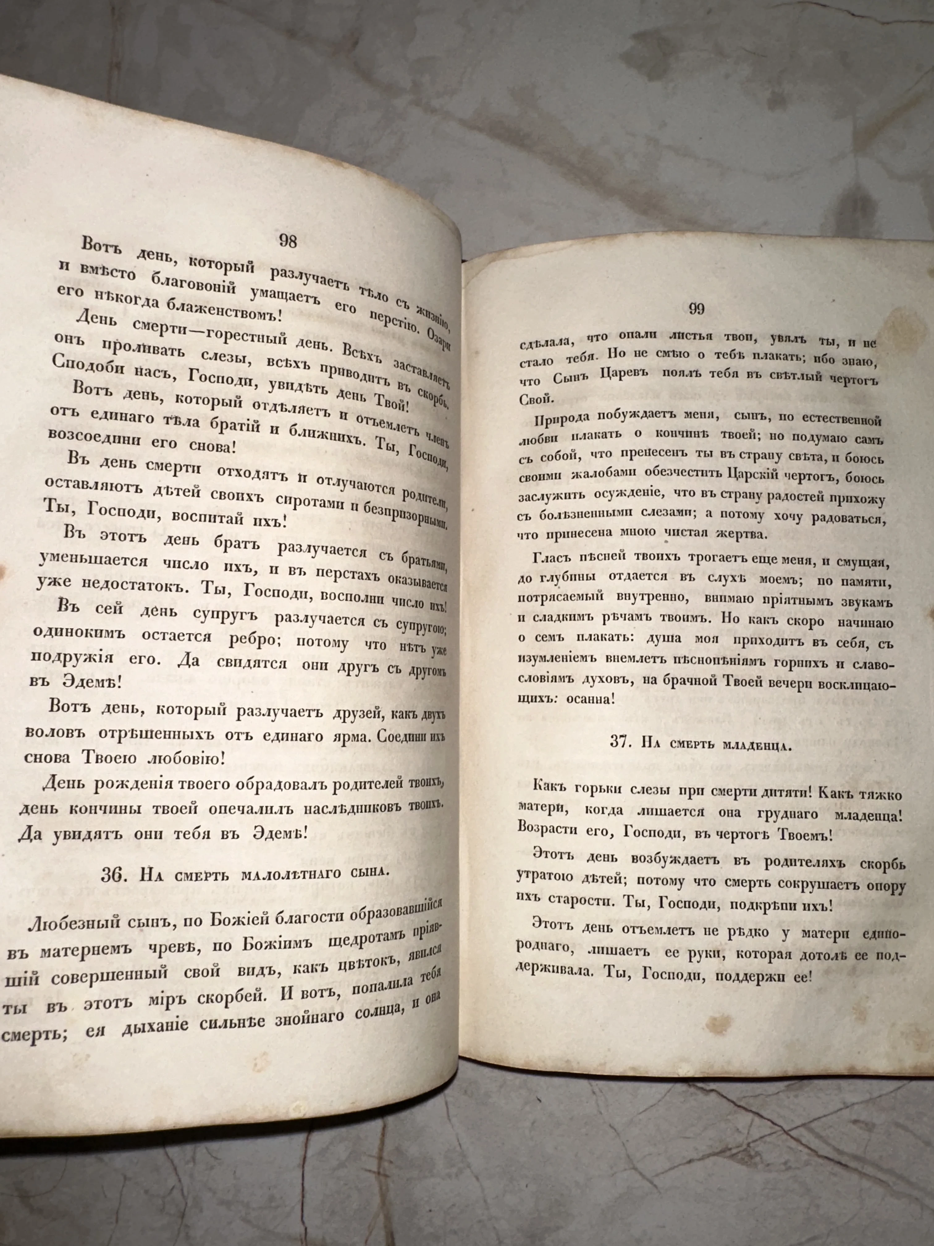 Разворот антикварной книги на русском языке с дореволюционной орфографией, страницы 98 и 99 с заголовками «На смерть малолетняго сына» и «На смерть младенца».