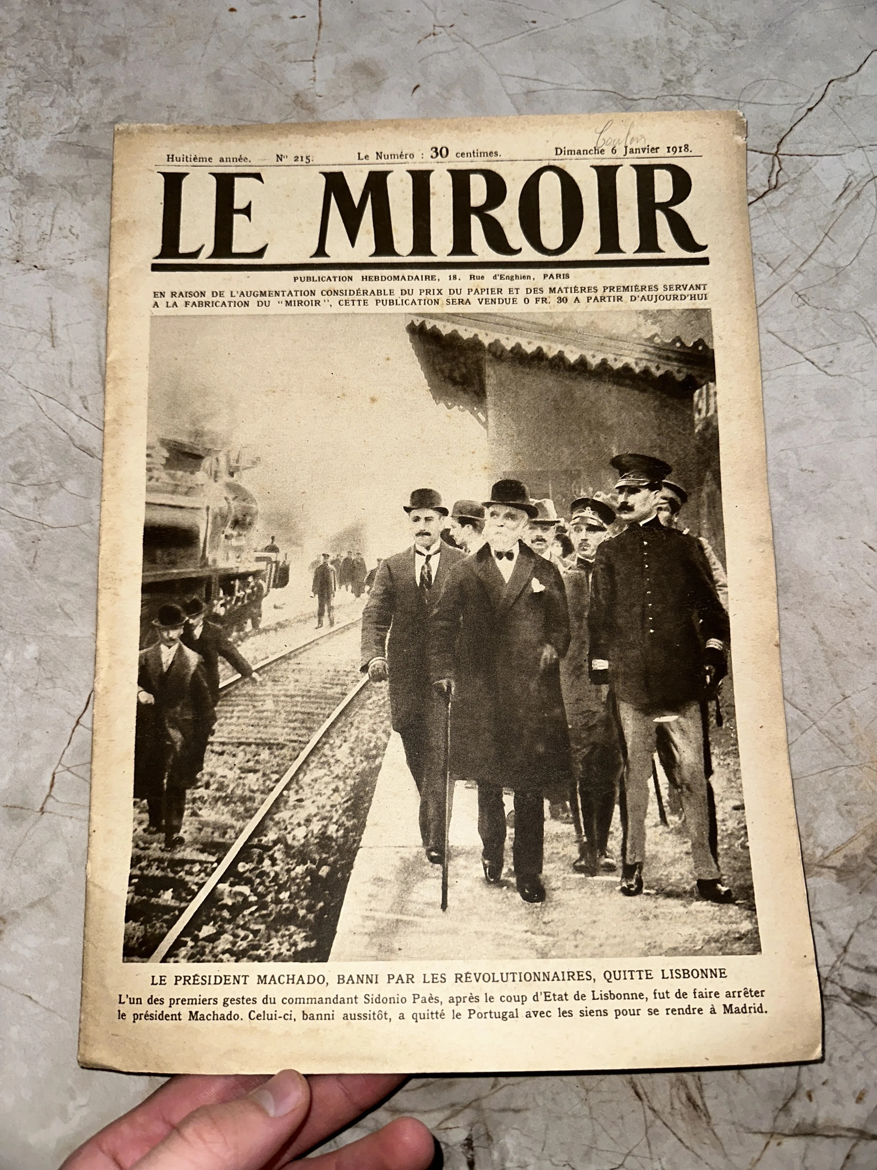 Обложка французского иллюстрированного журнала Le Miroir от 6 января 1918 года с фотографией президента Португалии Машаду на вокзале.