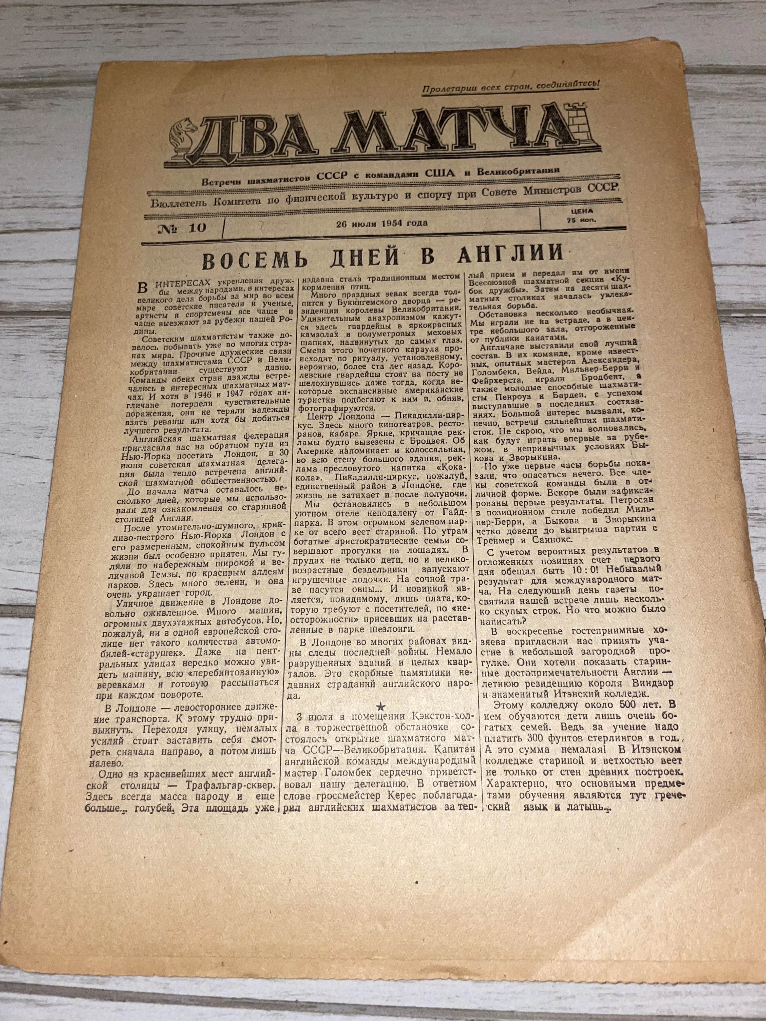 Подлинный артефакт советской спортивной истории, запечатлевший эпоху великого шахматного противостояния СССР с западными странами. На пожелтевших страницах представлен живой репортаж о пребывании советских гроссмейстеров в Лондоне, сочетающий спортивную хронику и атмосферные заметки о послевоенной Англии. Прекрасный коллекционный экземпляр для любителей шахматной эстетики и истории спорта.