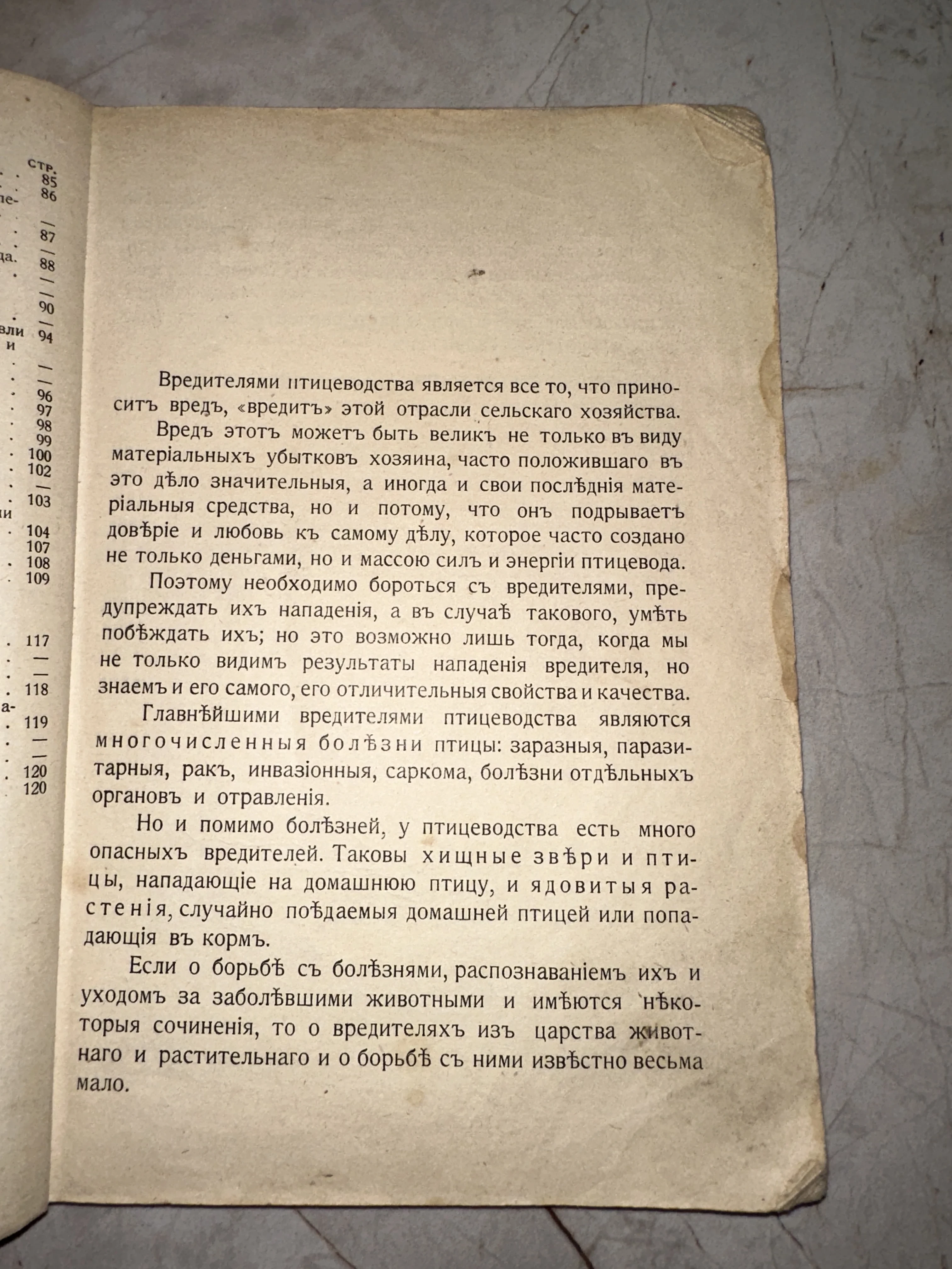 Аутентичный фрагмент сельскохозяйственного издания начала XX века, напечатанный с использованием дореволюционной орфографии. Пожелтевшая бумага с характерной патиной времени и следами активного использования хранит в себе крупицы знаний прошлого столетия о борьбе с болезнями и хищниками. Этот артефакт станет ценным дополнением коллекции тематической литературы или учебных пособий ушедшей эпохи.