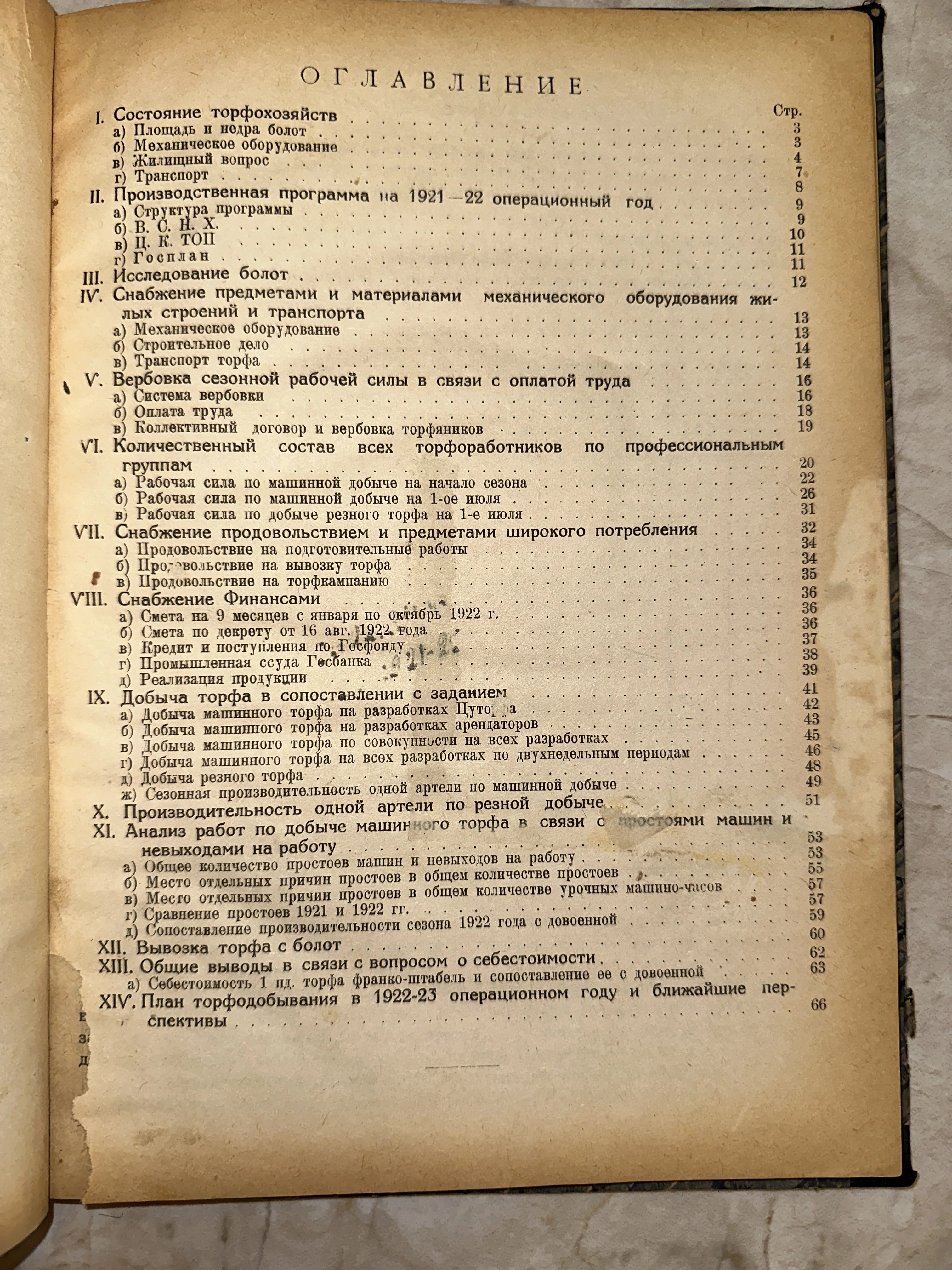 Оглавление отчета о состоянии торфохозяйств, 1922 год