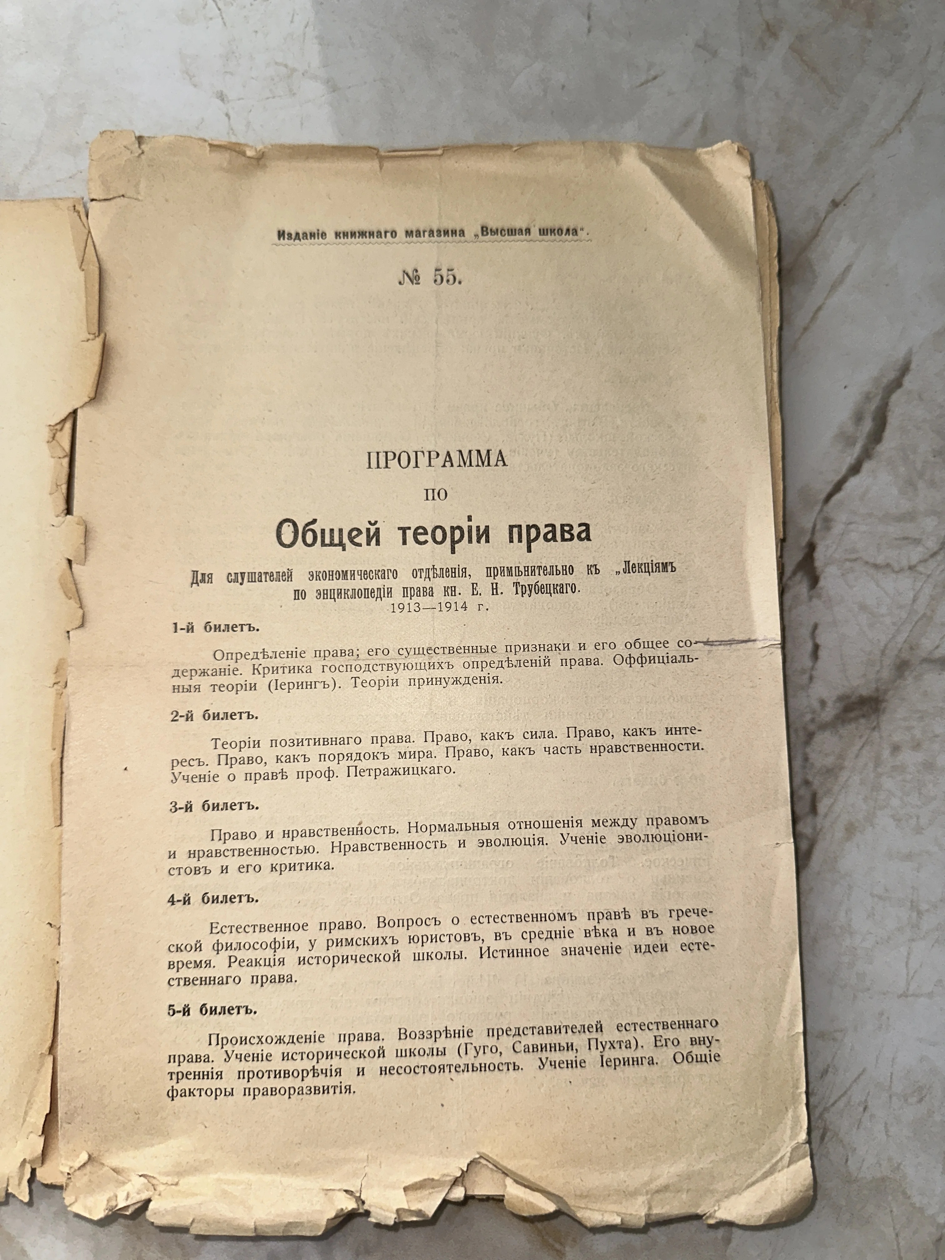 Редкий образец дореволюционной учебной литературы, изданный книжным магазином «Высшая школа» специально для слушателей экономического отделения. Артефакт сохранил атмосферу университетского образования Российской империи: пожелтевшая бумага с живописными неровными краями и строгая типографика начала XX века делают этот документ великолепным дополнением коллекции юридической старины.
