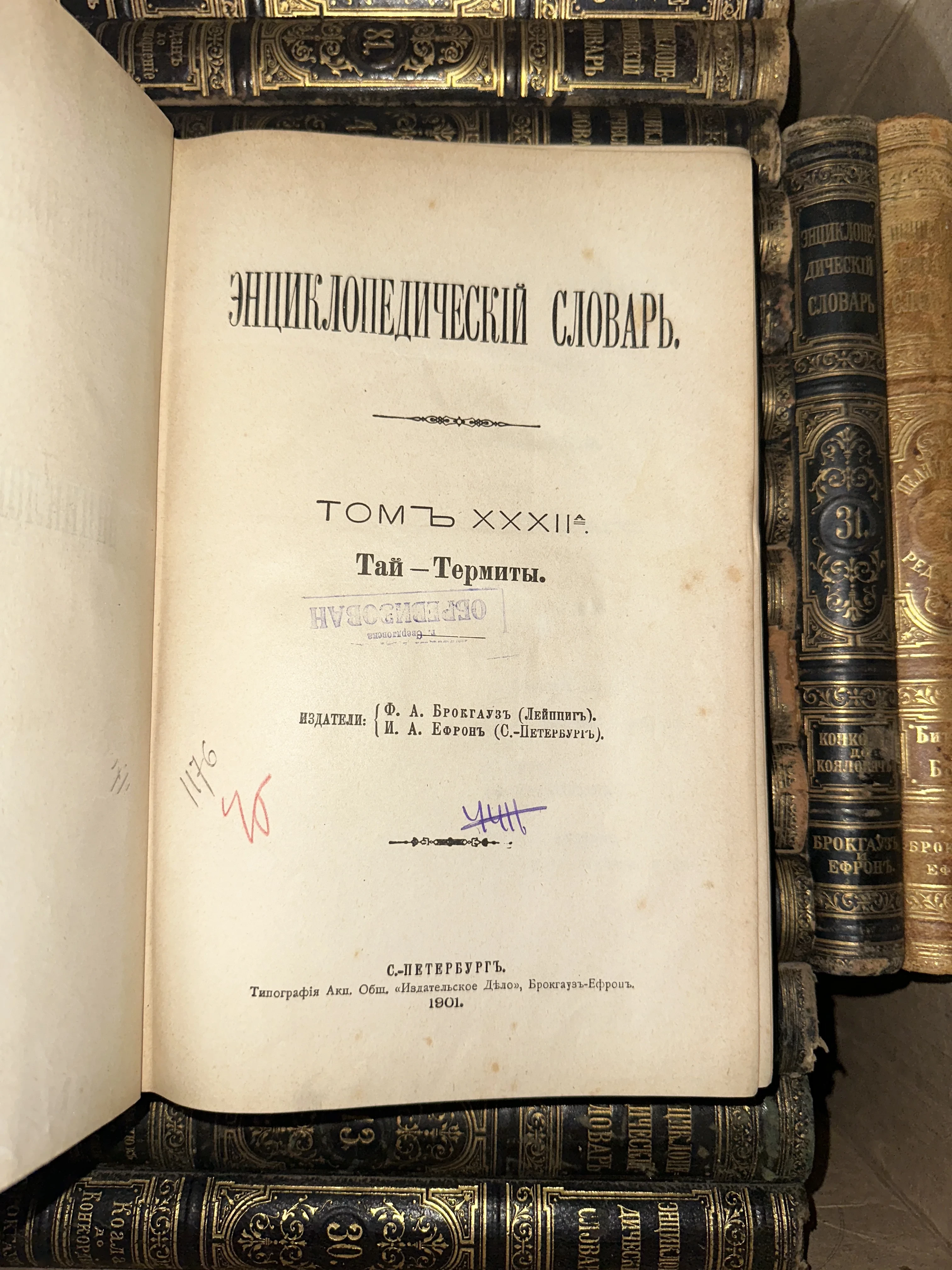 Раскрытый том легендарного энциклопедического словаря Брокгауза и Ефрона, изданный в 1901 году, передает величие дореволюционной научной мысли. Благородная патина времени на страницах, архивные пометы и роскошные золоченые корешки создают неповторимую атмосферу старинной частной библиотеки. Редкий образец типографского искусства Санкт-Петербурга начала XX века для истинных ценителей антиквариата.