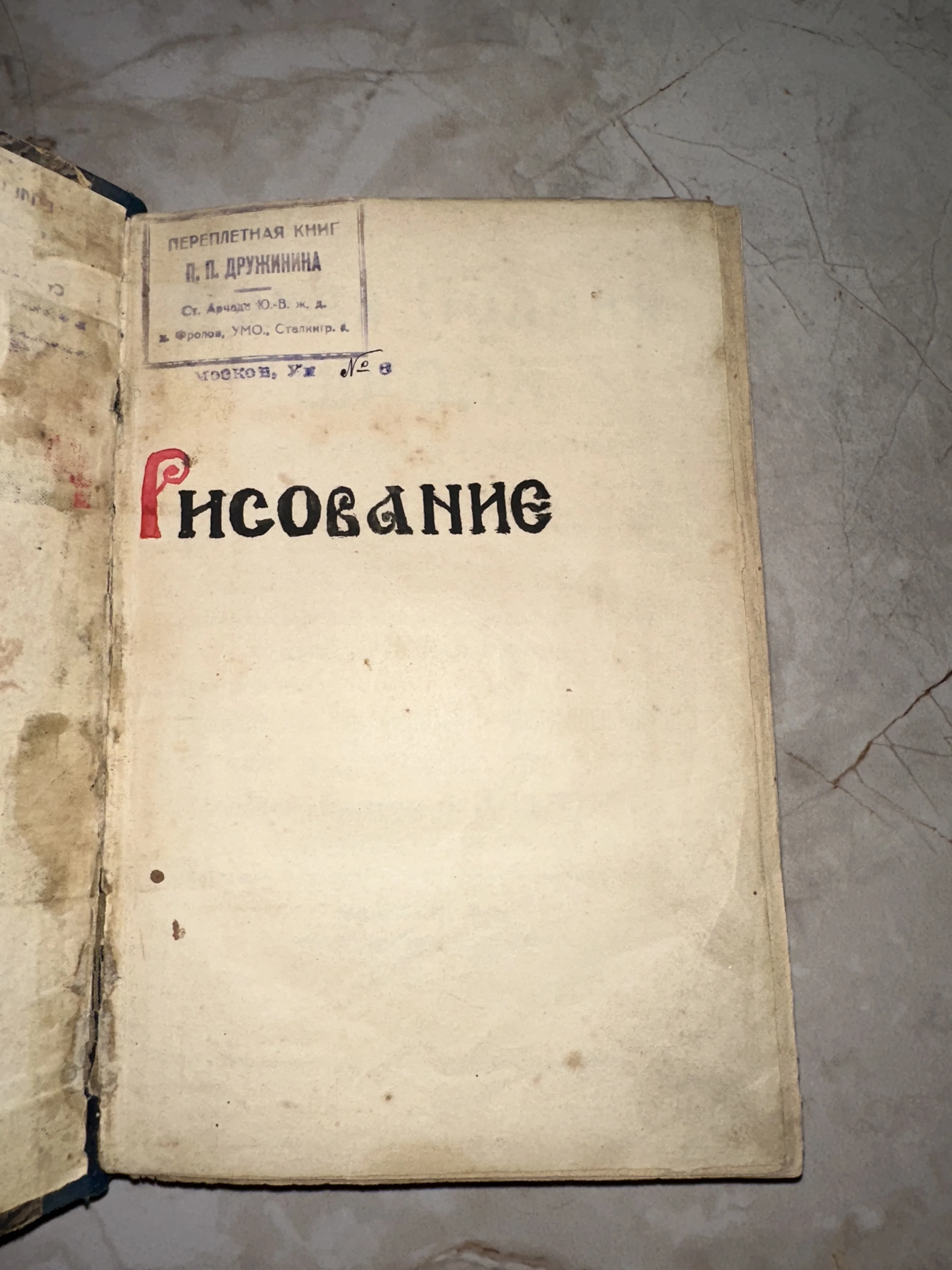 Титульный лист старинной книги с надписью «Рисование» и чернильным штампом переплетной мастерской П. П. Дружинина.