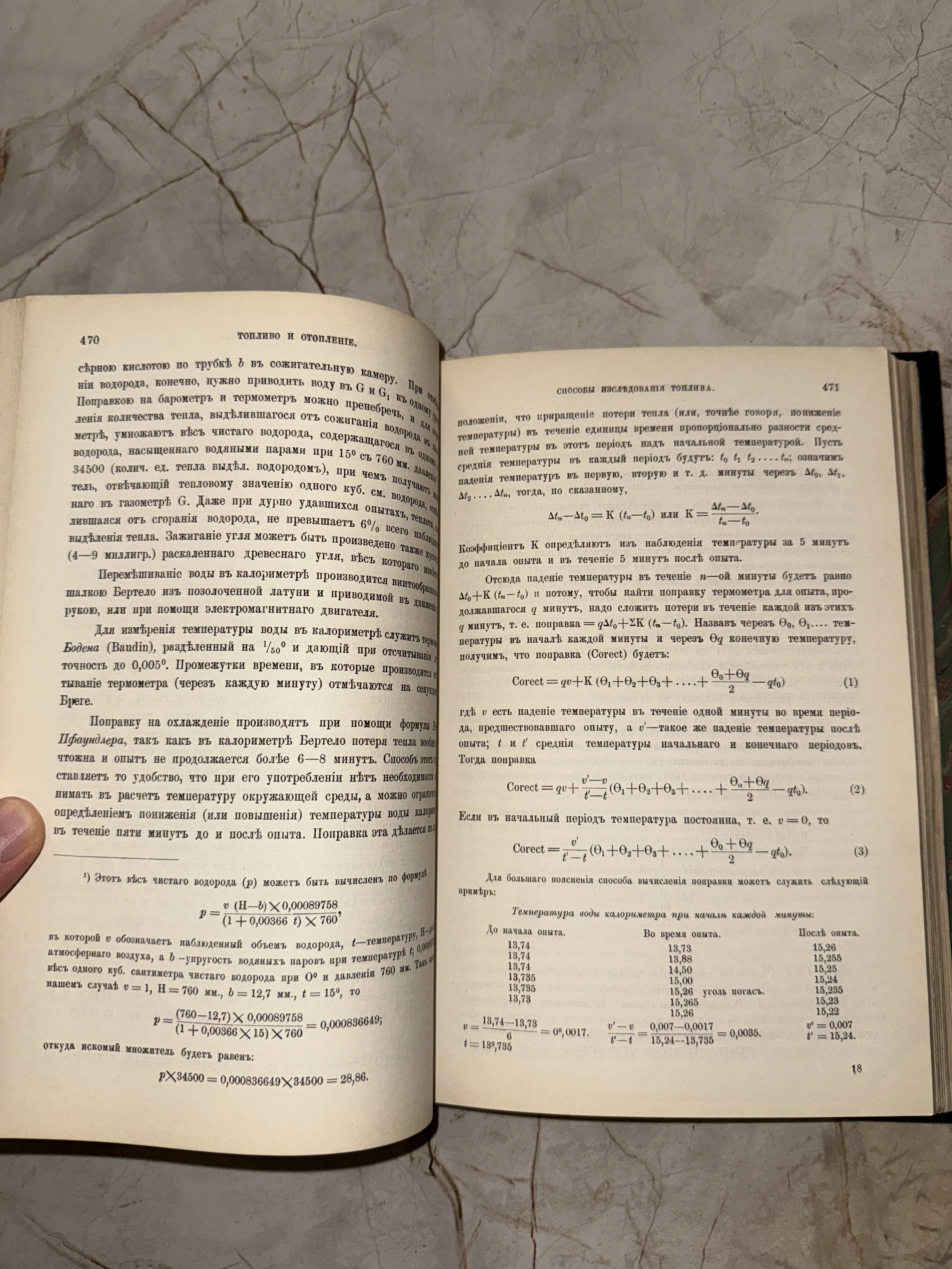 Разворот старинной книги с дореволюционным шрифтом, содержащий математические формулы, таблицы и текст о способах исследования топлива.