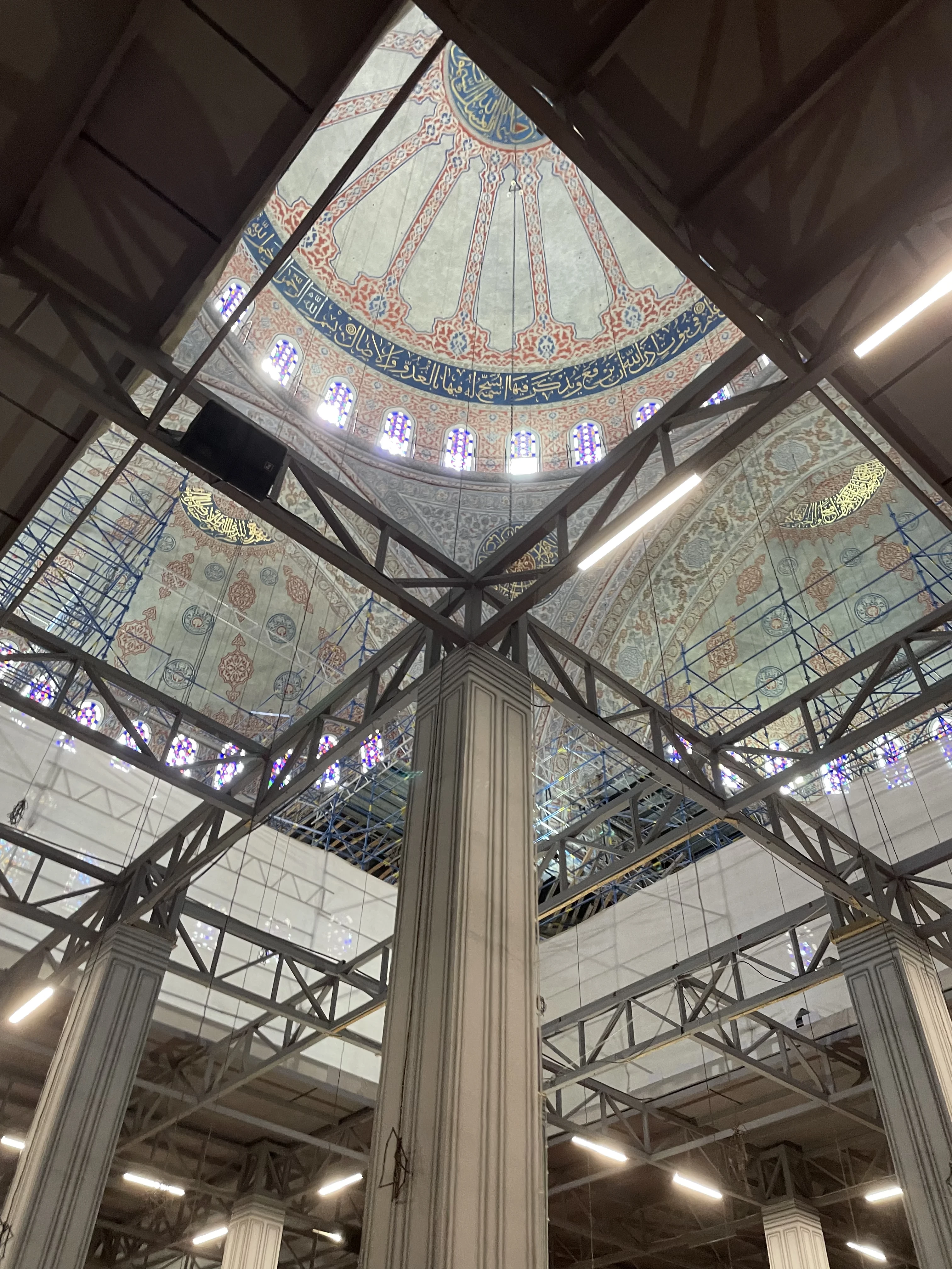 Взгляд сквозь современные инженерные конструкции открывает захватывающую дух красоту древнего купола. Изящная арабская вязь и тончайшие орнаменты свидетельствуют о филигранном мастерстве декораторов прошлого, бережно сохраняемом для потомков. Это уникальное сочетание монументальной истории и процесса её возрождения создает особую атмосферу преемственности эпох.