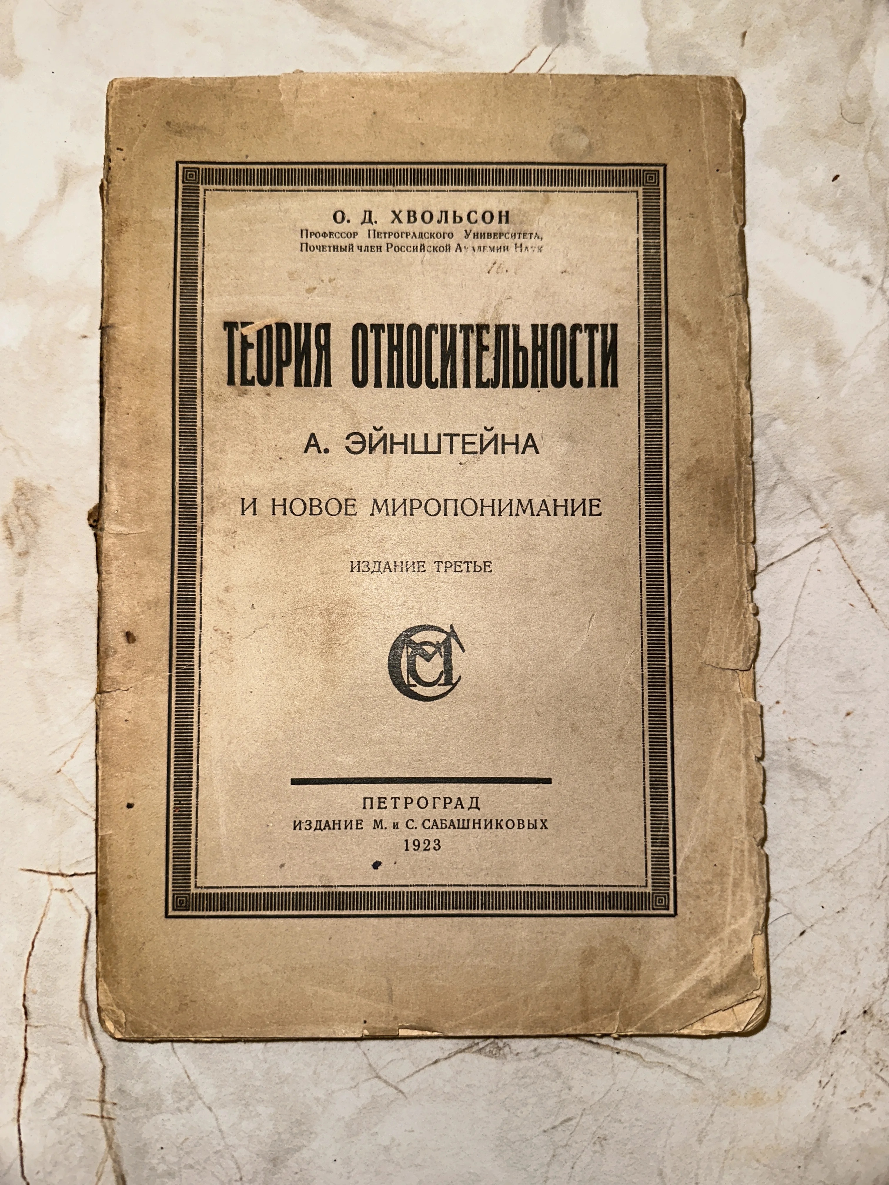 Обложка старинной научной книги О. Д. Хвольсона о теории относительности Эйнштейна, издание Сабашниковых, Петроград, 1923 год.
