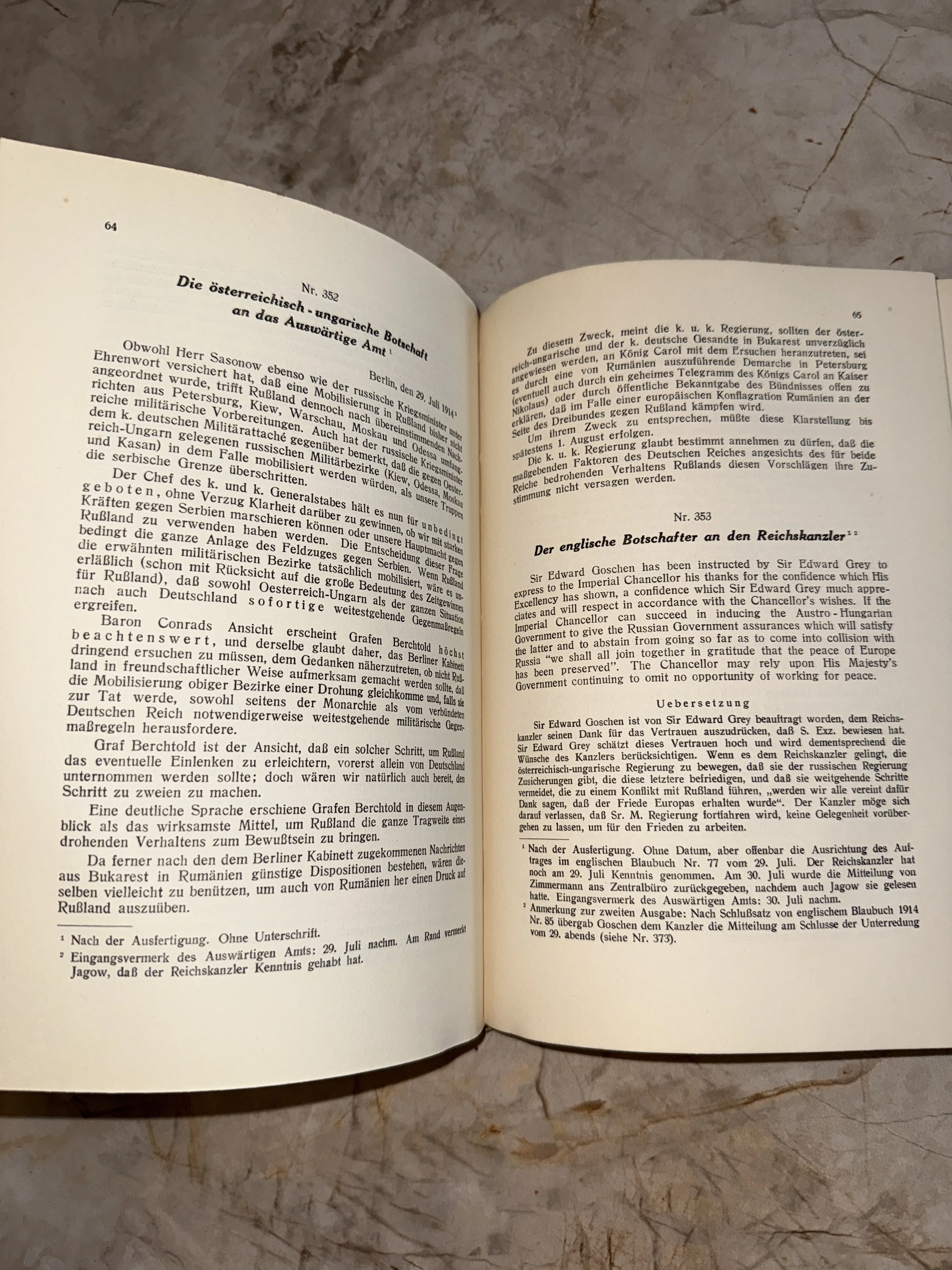 Разворот антикварной книги с текстом на немецком языке, содержащим дипломатическую переписку накануне Первой мировой войны.
