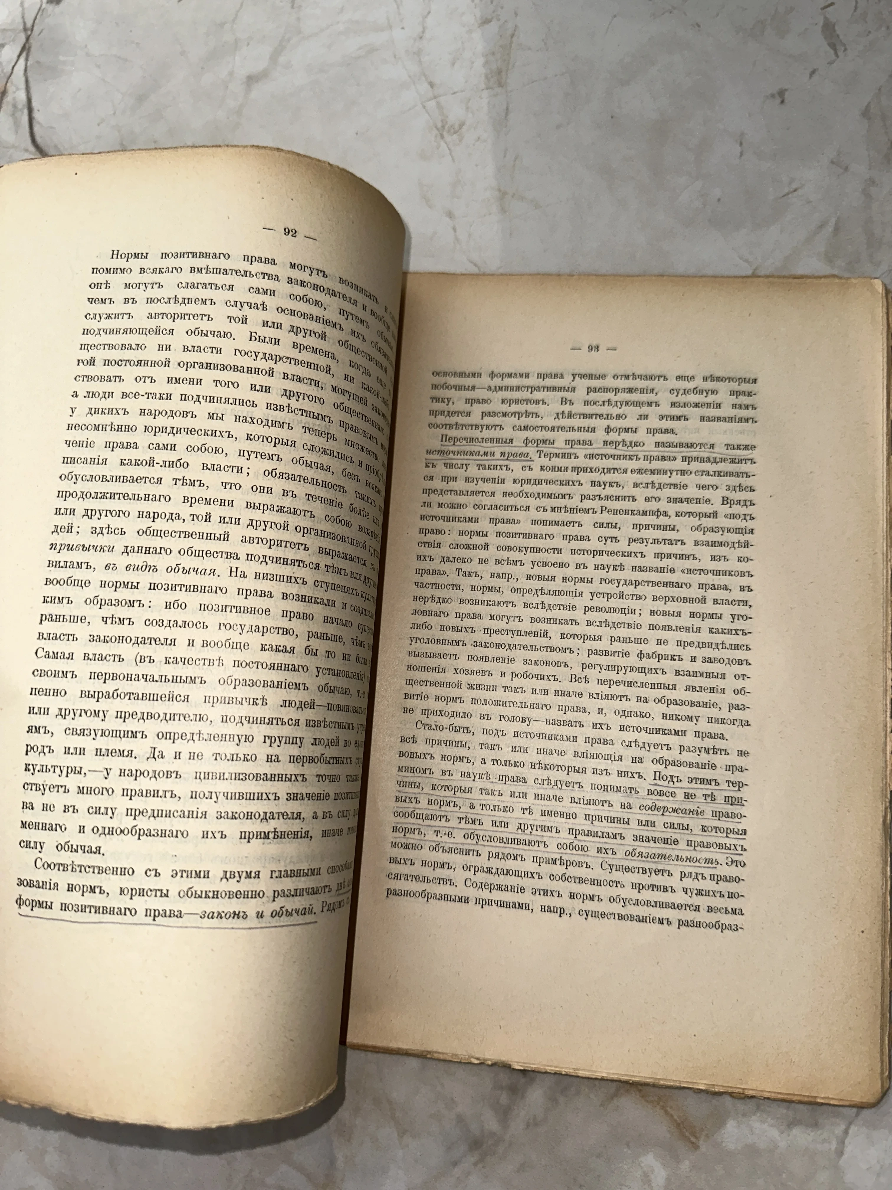 Редкий экземпляр дореволюционной учебной литературы, раскрывающий основы юриспруденции и теории права. Страницы сохранили благородный оттенок патины времени, а дореформенная орфография придает изданию особую историческую достоверность. Идеальный экспонат для частной коллекции или аутентичный подарок профессиональному юристу.