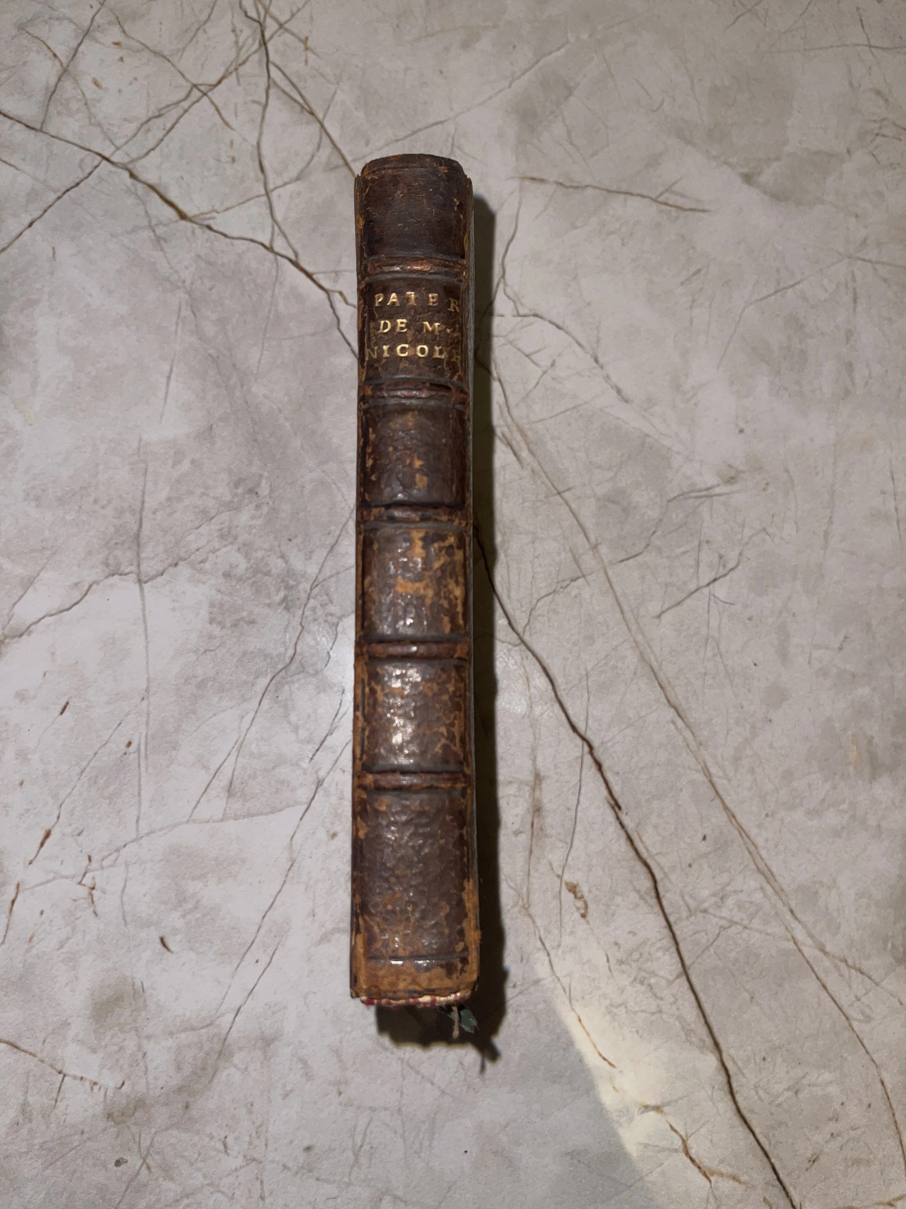 Вид сверху на корешок старинной книги в коричневом кожаном переплете с золотым тиснением PATER DE M. NICOLE.