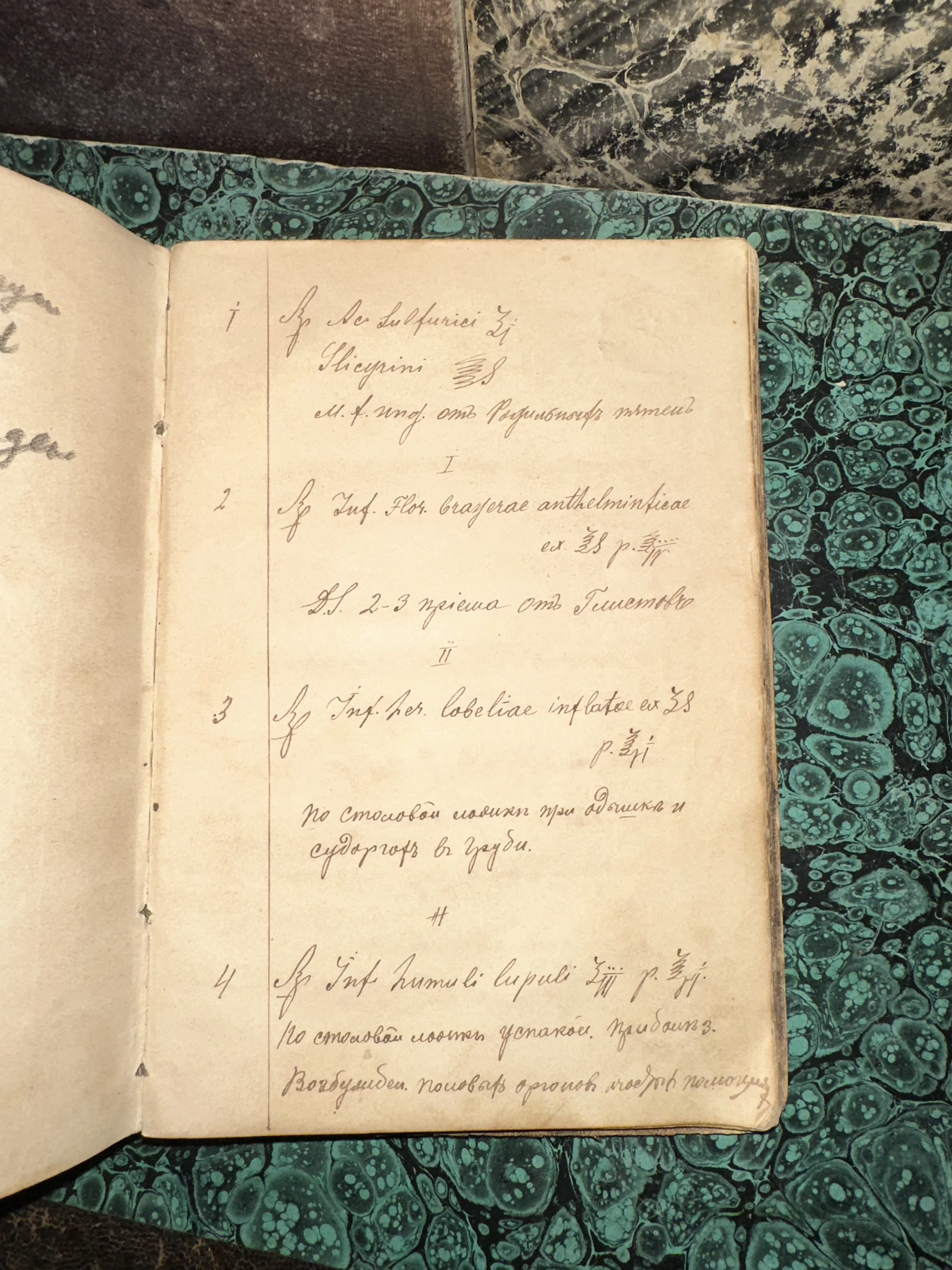 Этот редкий манускрипт представляет собой подлинный образец врачебного дела прошлого, где каждый рецепт выведен изящным каллиграфическим почерком. Страницы с легким пожелтением и характерной текстурой дополнены эффектной подложкой из бирюзовой мраморной бумаги, подчеркивающей статус предмета. Артефакт сохранил дух эпохи и станет ценным приобретением для ценителей истории медицины.