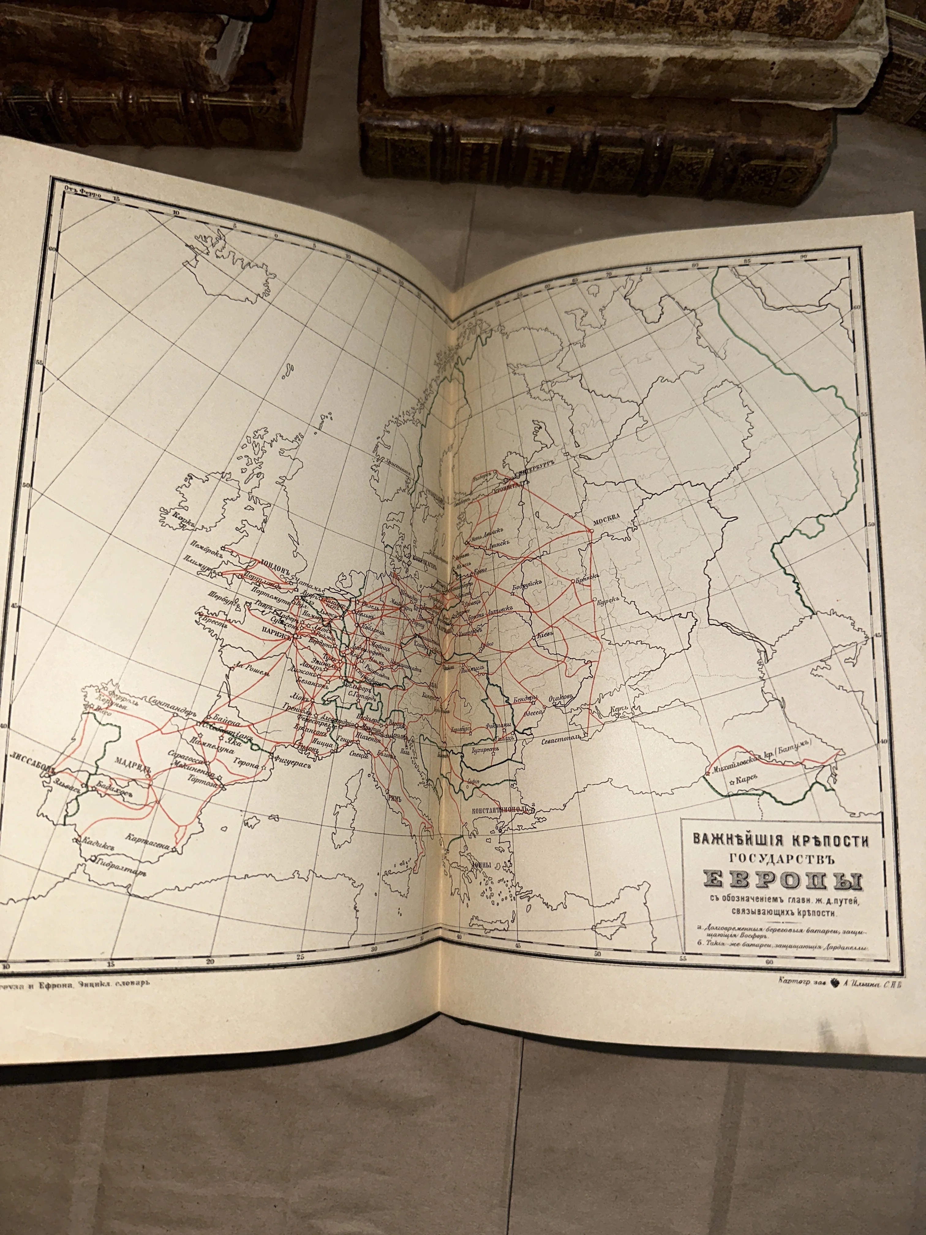 Изысканный разворот из легендарного словаря Брокгауза и Ефрона, представляющий детальную схему европейских укреплений и транспортных артерий рубежа веков. Карта выполнена с филигранной точностью, а благородная патина времени на бумаге подчеркивает её подлинность и историческую ценность. Идеальный экземпляр для ценителей военной истории и редкой кабинетной картографии.
