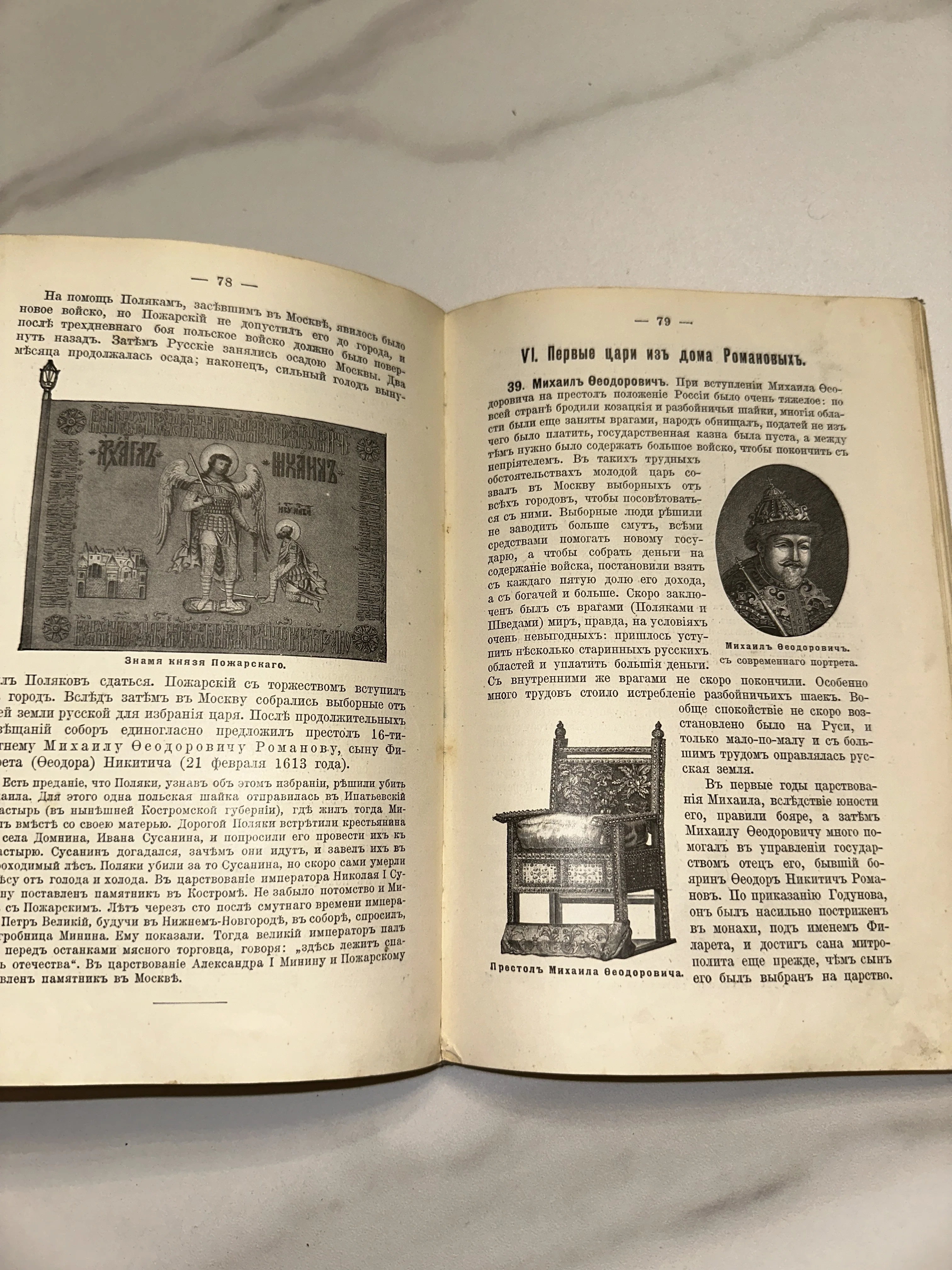 Уникальный книжный разворот, повествующий о воцарении династии Романовых и подвигах героев Смутного времени. На пожелтевших страницах соседствуют детальные изображения знамени князя Пожарского, портрет молодого царя Михаила Федоровича и его монументальный престол. Издание представляет коллекционную ценность благодаря отличной сохранности типографских иллюстраций и очарованию дореформенной орфографии.
