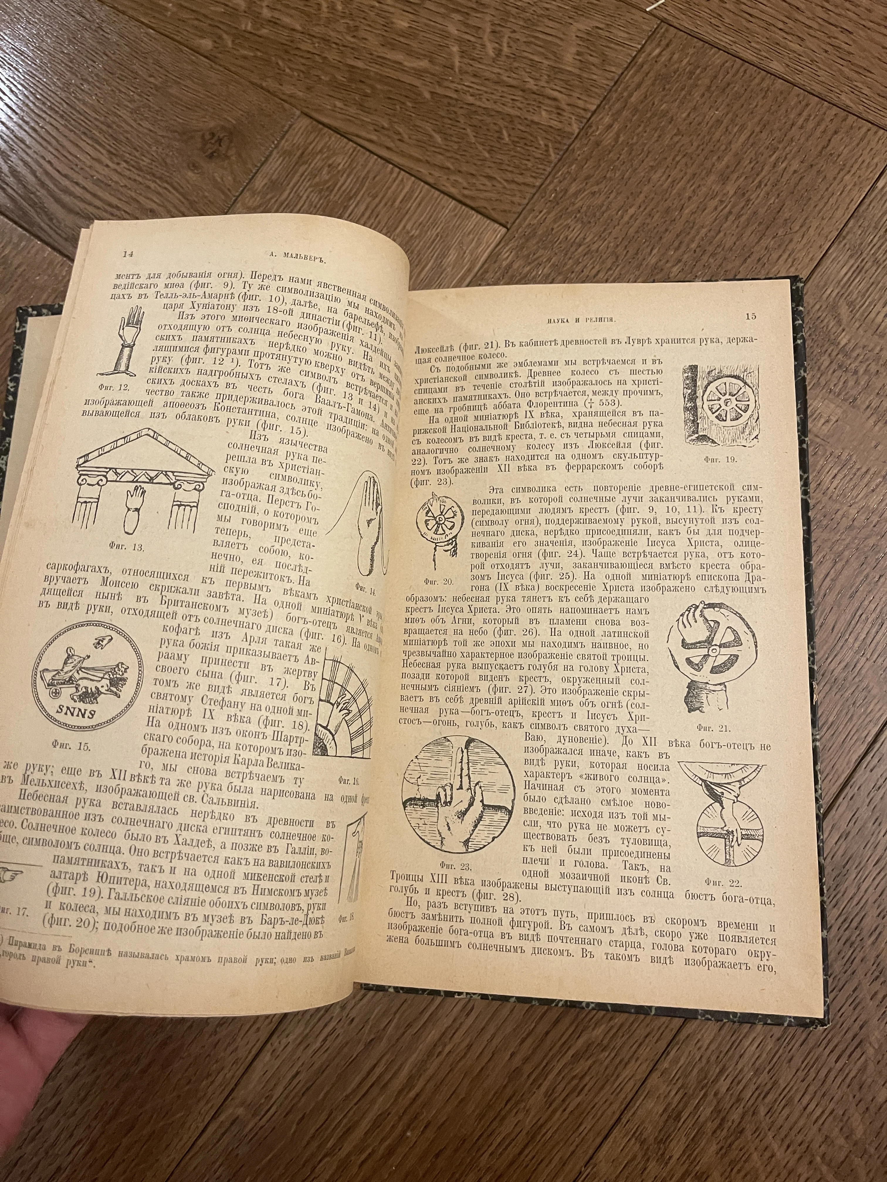 Уникальный разворот антикварного труда А. Мальвера, посвященного сравнительному анализу символики. Текст напечатан дореволюционной кириллицей и сопровожден детальными гравюрами, изображающими сакральные жесты и солярные знаки. Пожелтевшие от времени страницы сохранили превосходную четкость печати и атмосферу интеллектуальных поисков начала XX века.
