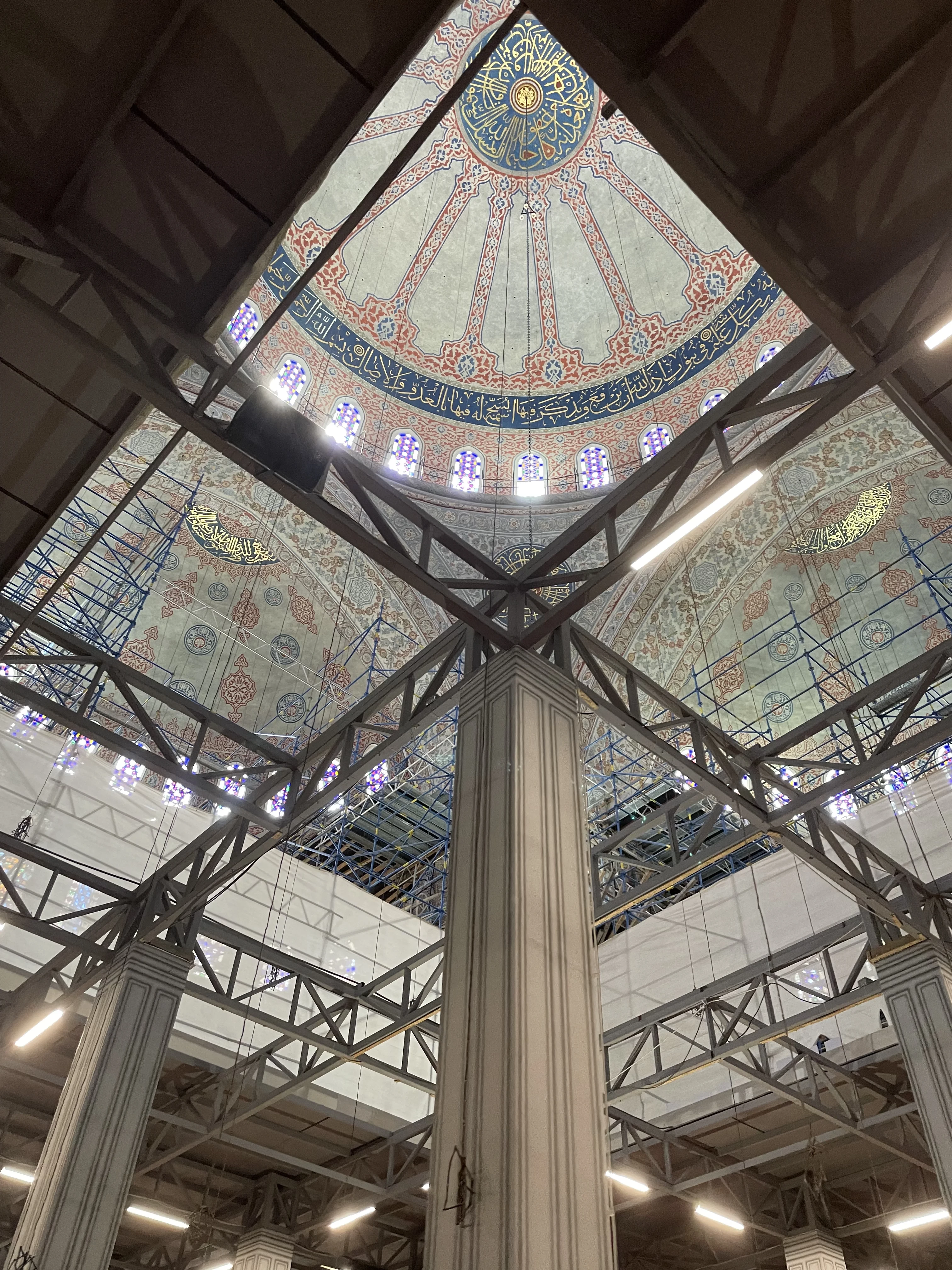 Вид снизу вверх на расписной купол мечети с каллиграфией, окруженный металлическими строительными лесами.