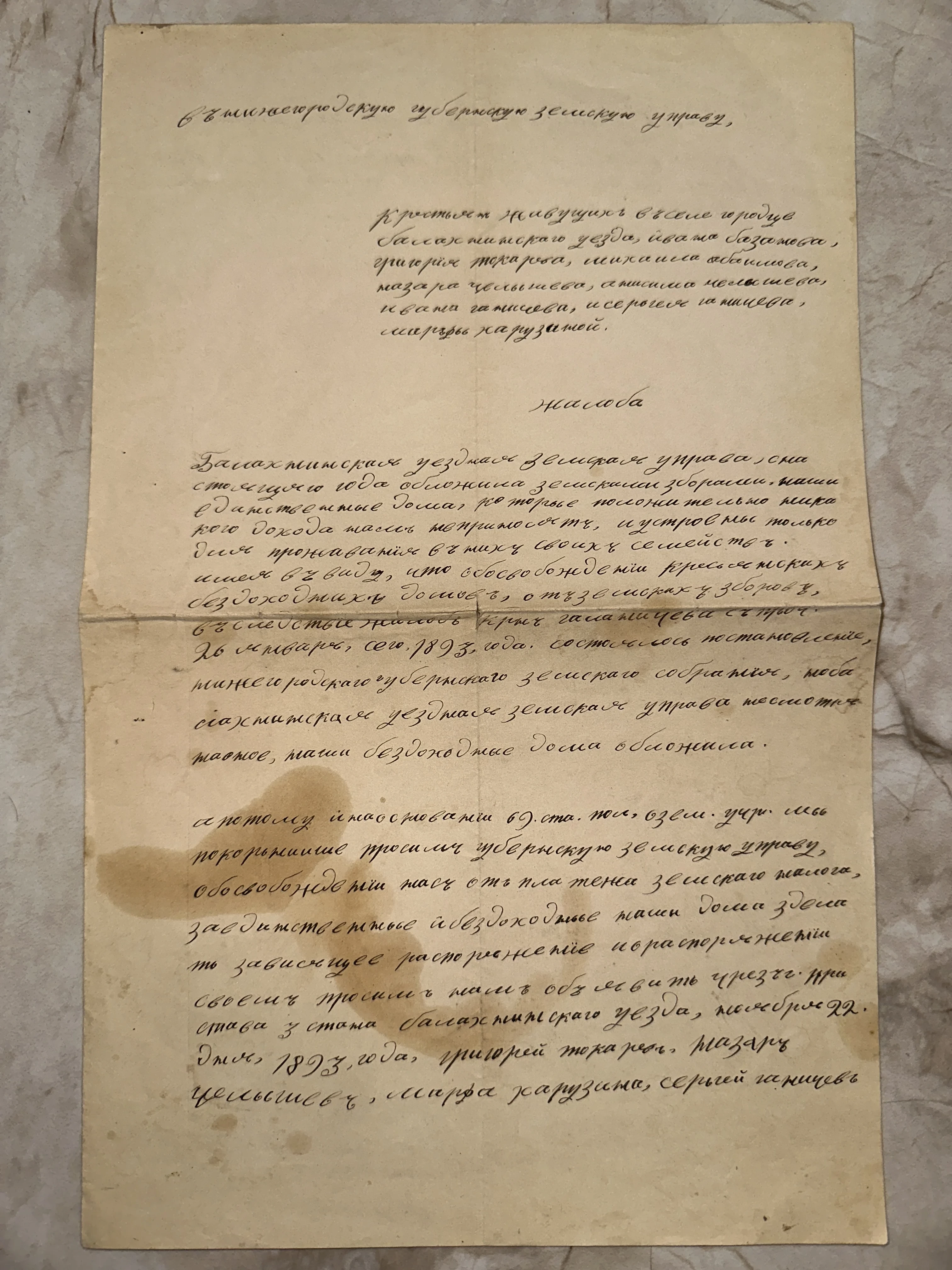 Старинный рукописный документ 1893 года на пожелтевшей бумаге, коллективная жалоба крестьян в Нижегородскую земскую управу.