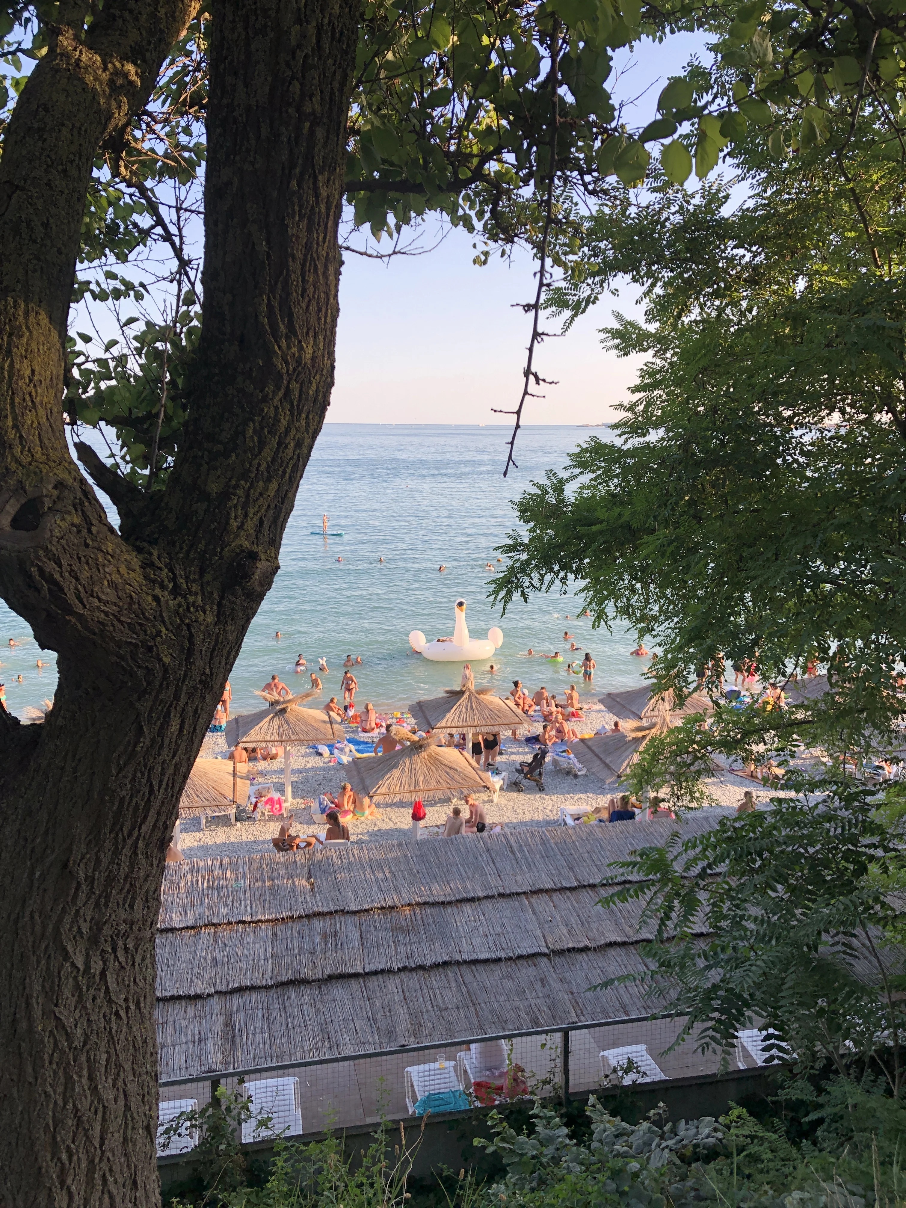 Вид на оживленный галечный пляж с соломенными зонтиками и большим надувным лебедем сквозь ветви деревьев.
