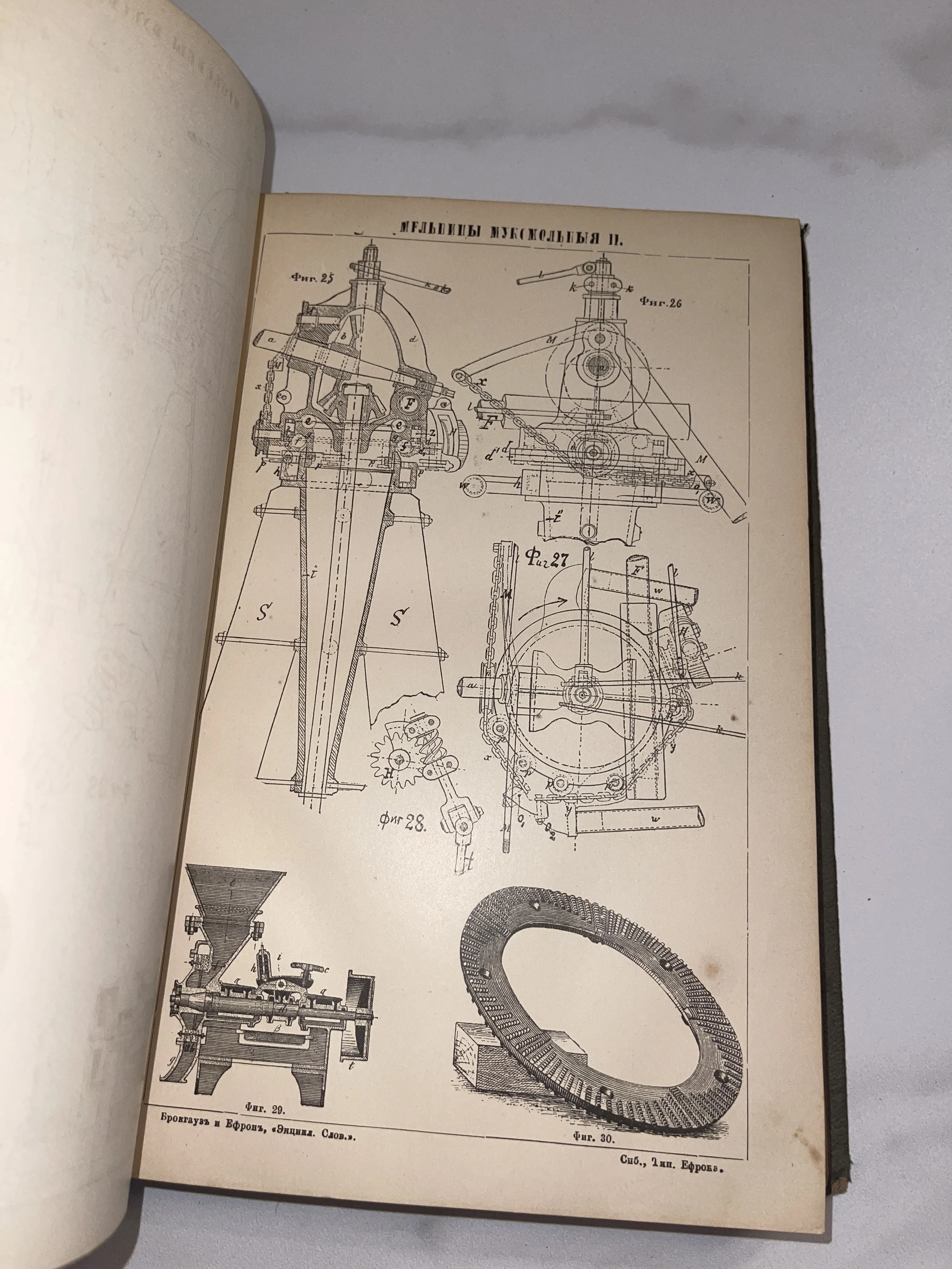 Подлинный лист из знаменитого энциклопедического словаря Брокгауза и Ефрона, запечатлевший торжество инженерной мысли XIX века. Тонкая прорисовка деталей мукомольных механизмов и характерная патина времени на бумаге создают неповторимую атмосферу классического научного издания.